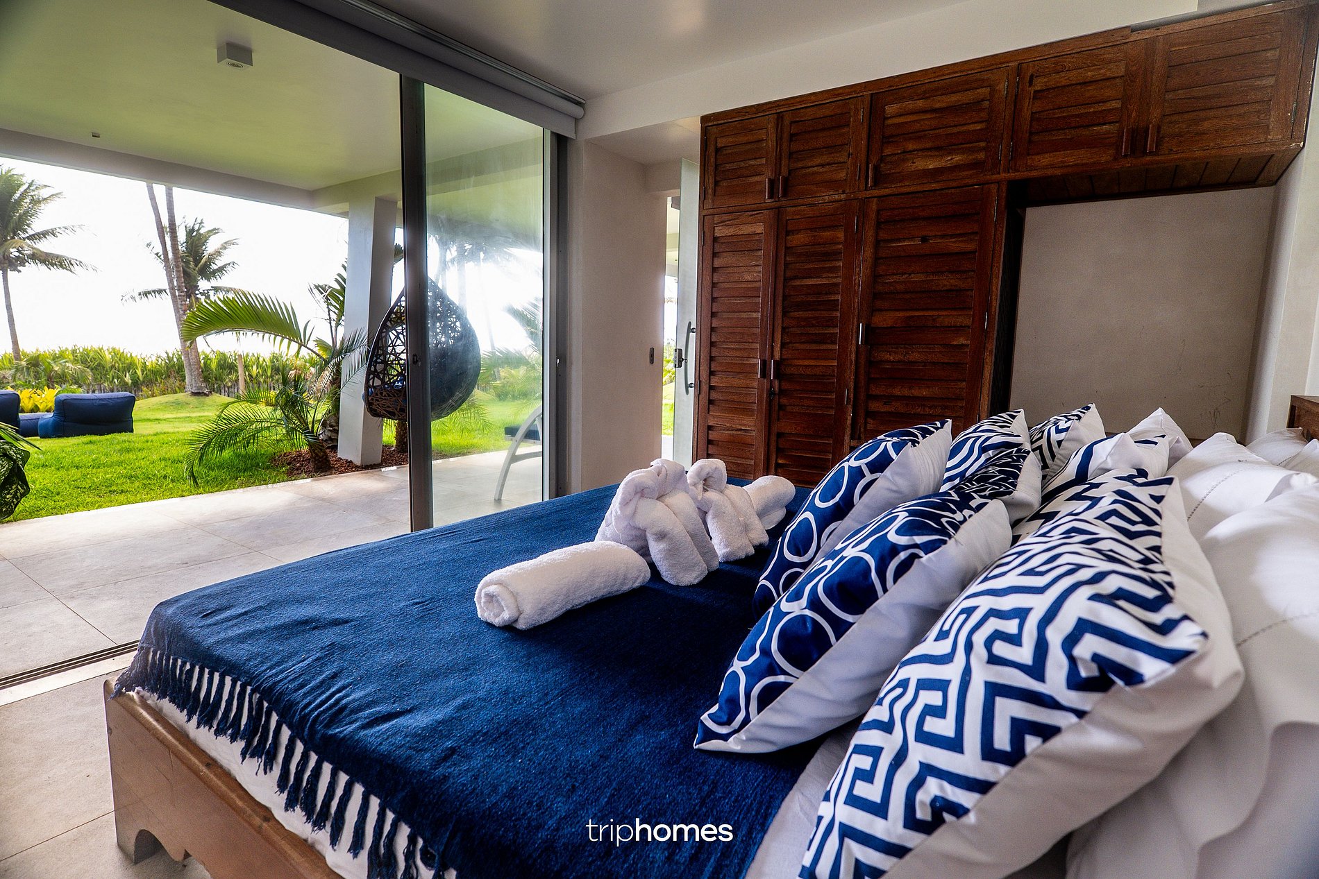 • Gourmet Balcony: Two wooden tables (seating 6 and 5), metal barbecue with hood, stone countertop, and views of the coconut grove and ocean. • Suite 5 – Master: queen-size bed, Gree inverter air conditioning, eight-door closet, private balcony, and bathroom with two sinks, organic mirror, and glass shower enclosure.