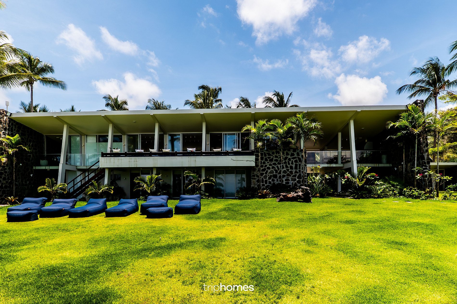 Pool table with black top, foosball table, scoreboard, and rustic log table. Wooden sofa with blue upholstery and nautical cushions. Cross ventilation and ocean views.