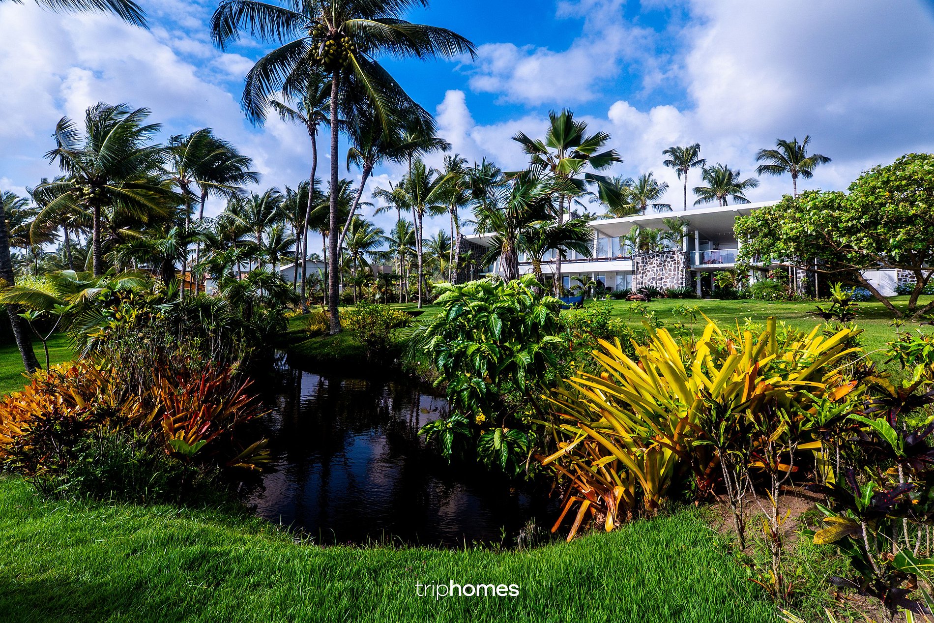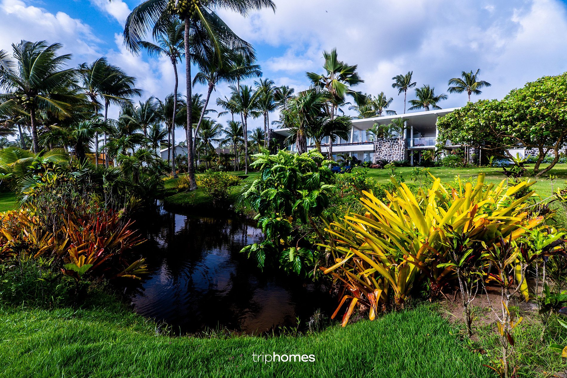 Landscaping with coconut trees, flowerbeds, an ornamental pond, and recessed lighting.