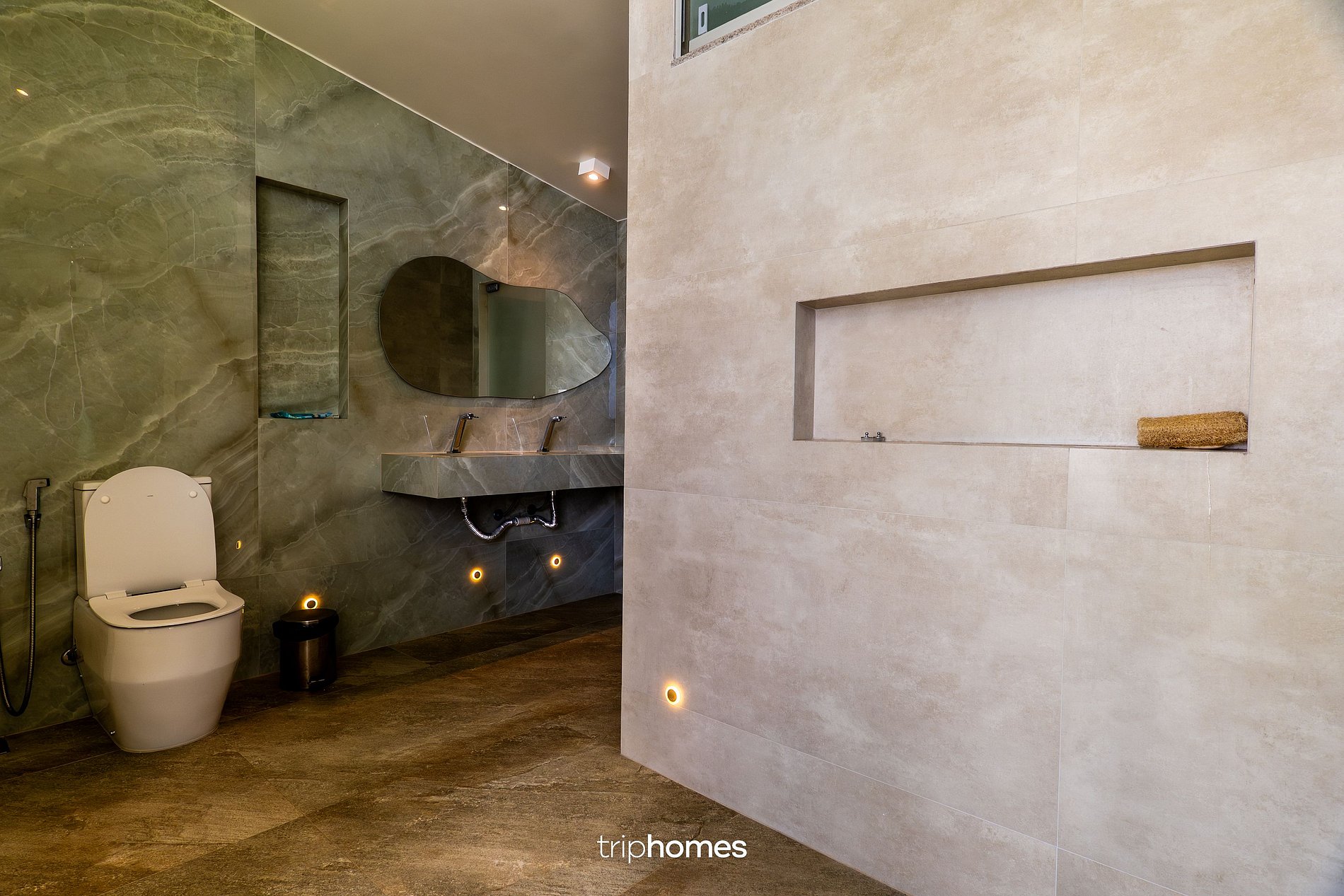 • Suite 3: king-size bed, built-in closets, Gree inverter air conditioning, and a bathroom with blue/beige porcelain tile and a square shower. Optionally connects to Bedroom 4.