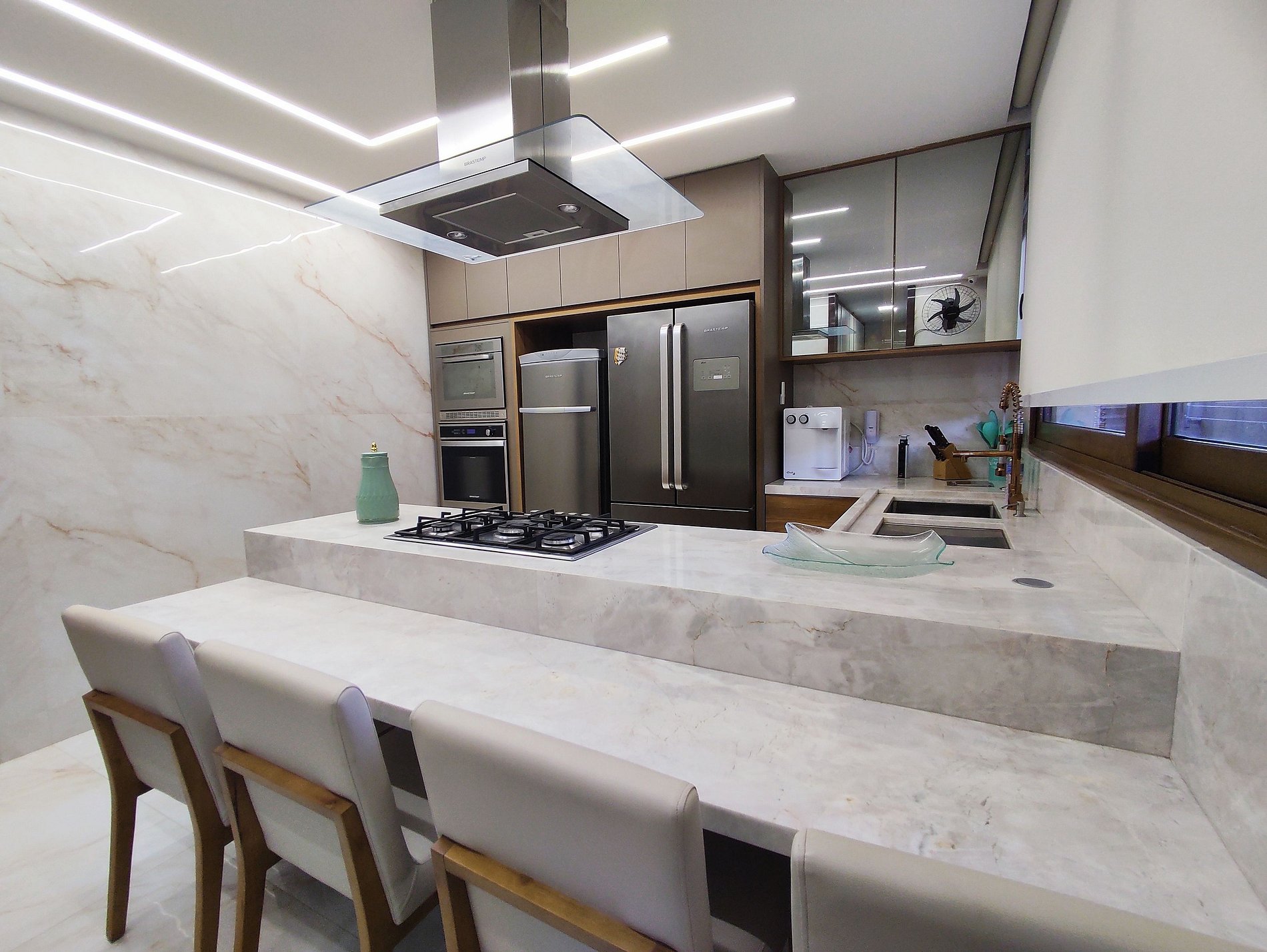 The external leisure area has a magnificent space in marble and granite, a sensational hydro and swimming pool with a transparent and infinite border, providing an extraordinary glimpse of the sunset. A wonderful wooden deck integrated to the gourmet area with barbecue, 80-inch SMARTV, surround sound, luxury chairs and loungers, and a swing for you to register in this simply fantastic environment.