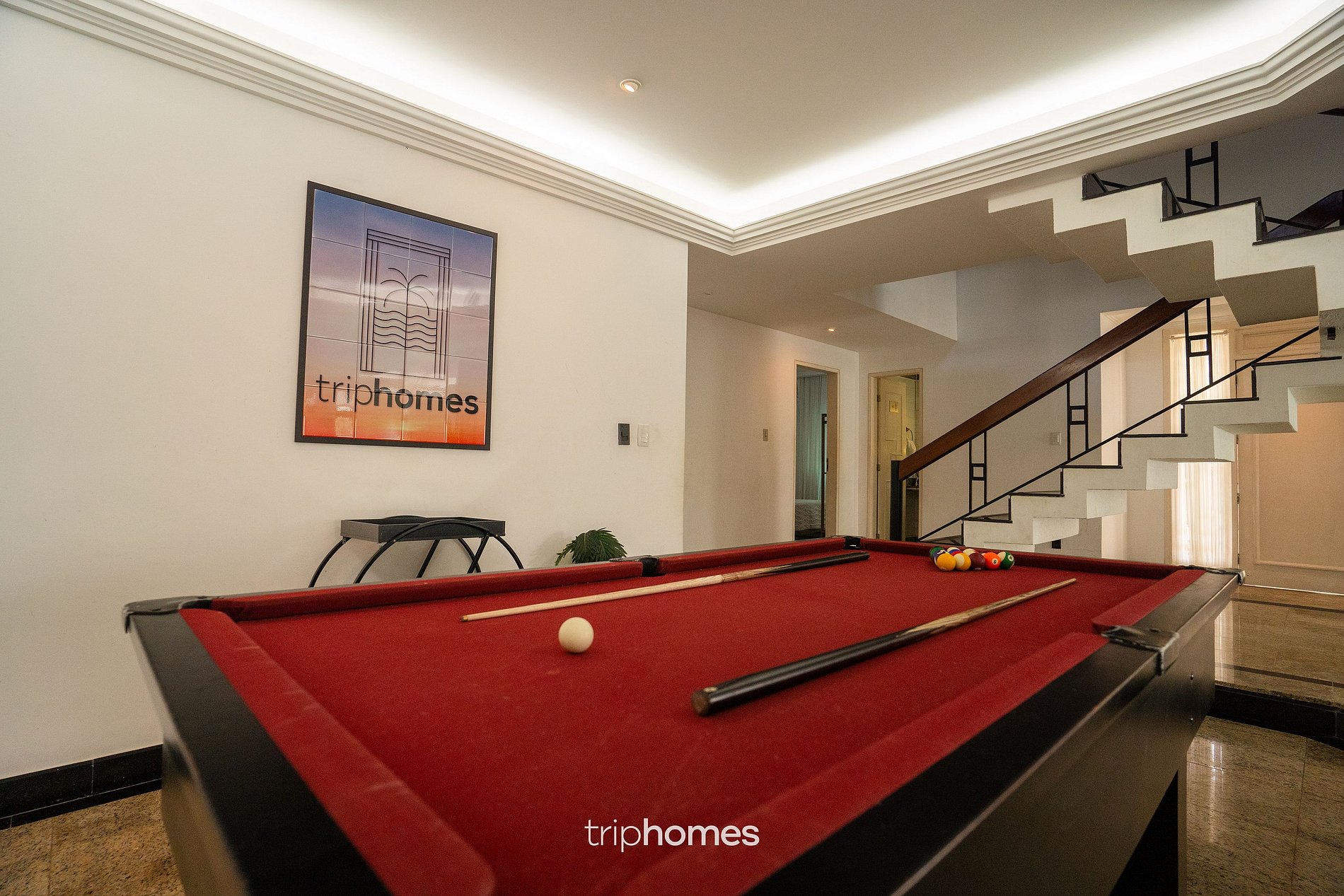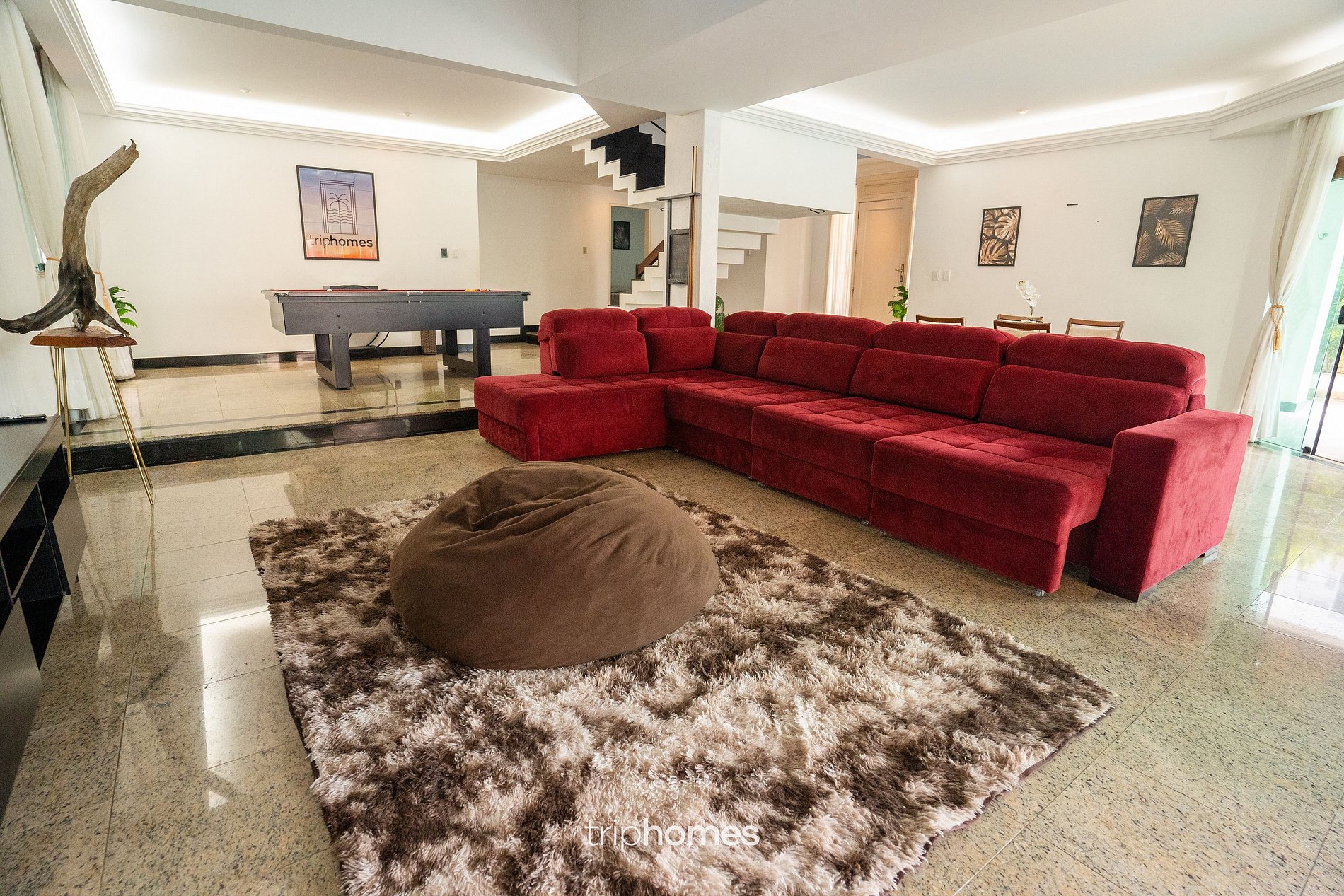 In the living room, enjoy the comfort of a huge 8-seater sofa, 80-inch Smart TV and a marble table for 6. For entertainment, there is a semi-professional pool table at your disposal.