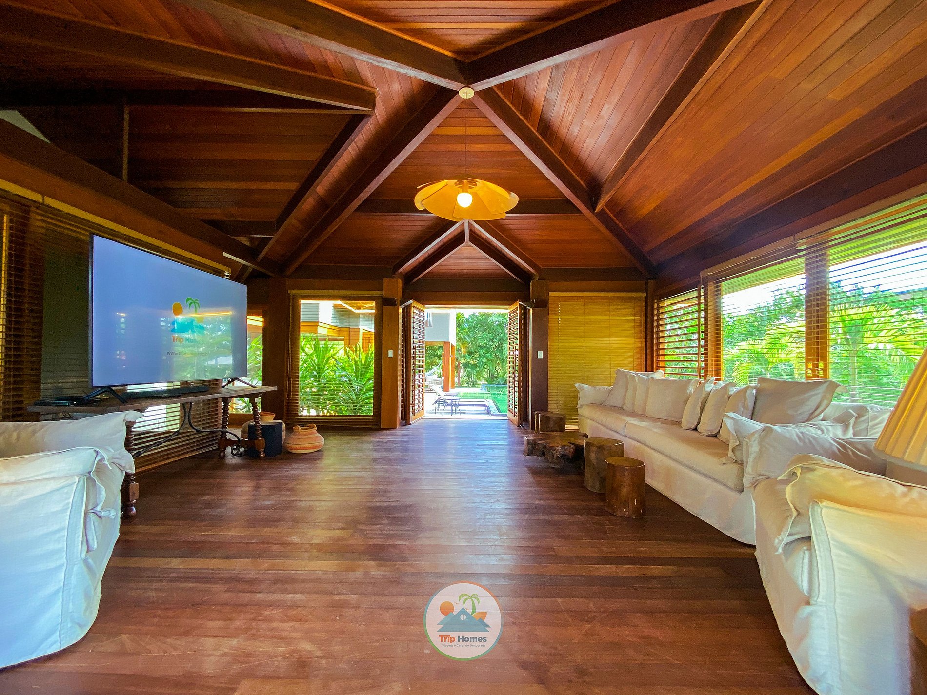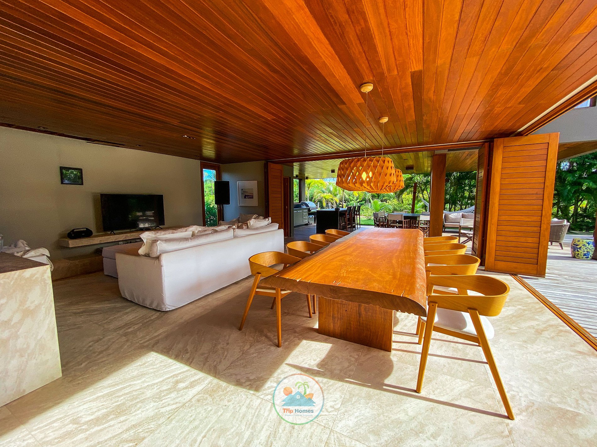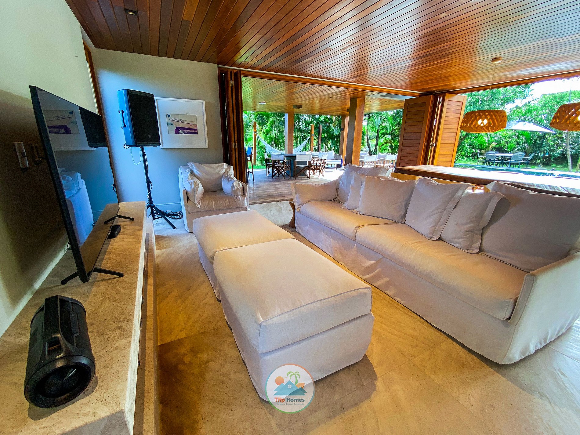 Entering the house, a large and spacious living room divided into three areas: living room with 60' TV, dining room with a lot of elegance and style, and a phenomenal leisure area. The living room and dining room give access to the pool, through large sliding doors, integrating it into the leisure area. All this with two JBL speakers and architecture that facilitates the ventilation of the space, for the leisure and comfort of your family.
