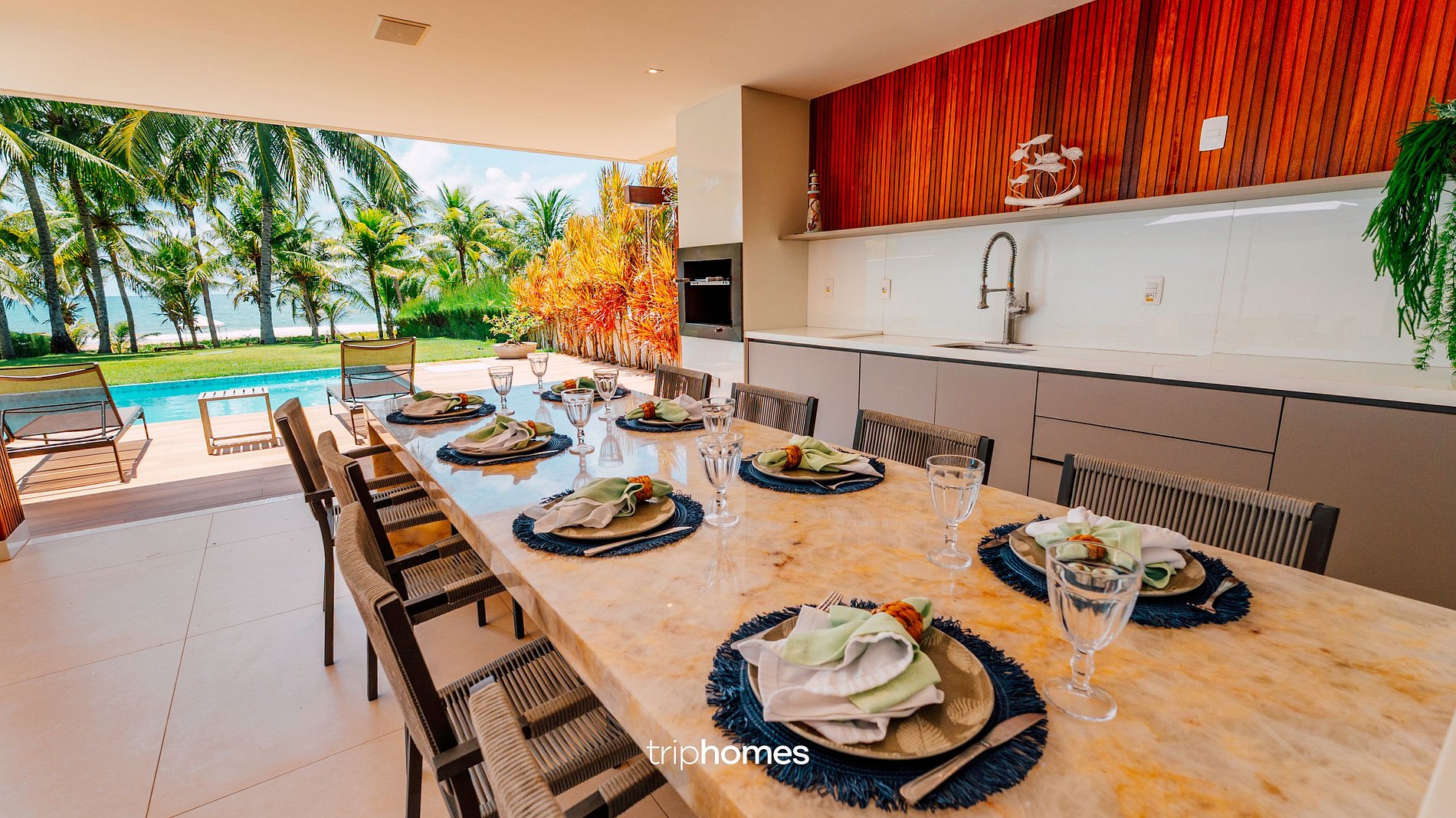 Covered area: marble table for 8 people, porcelain barbecue, water filter, large beer garden, medium wine cellar and 45” TV.