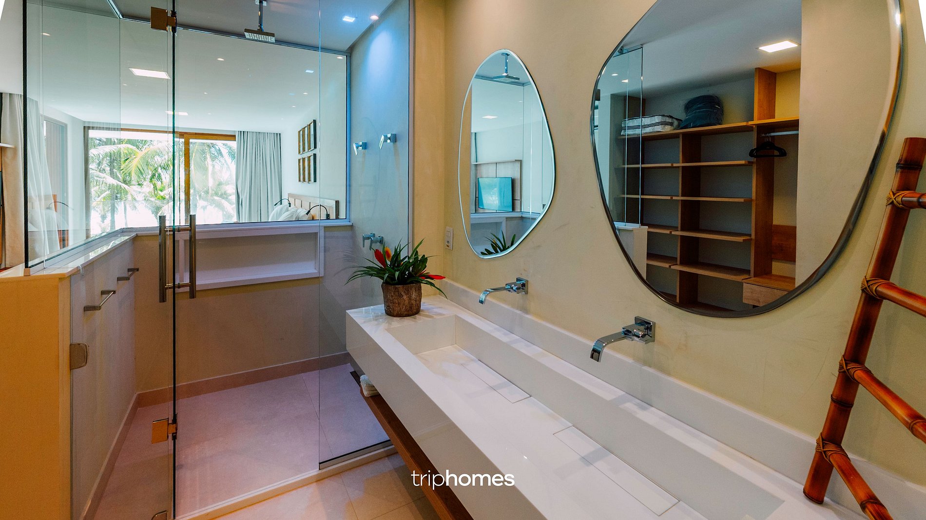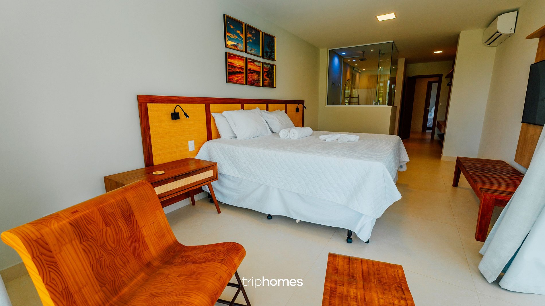 Master Suite: King bed + 2 auxiliary supports (4 guests) | 50” TV | Double ceiling shower | Sea view