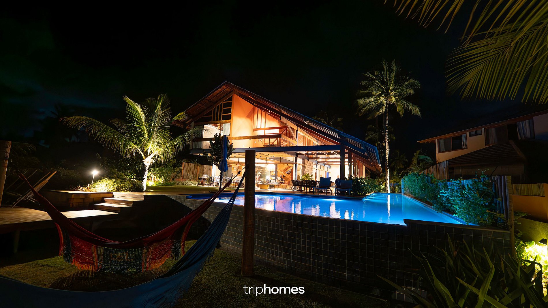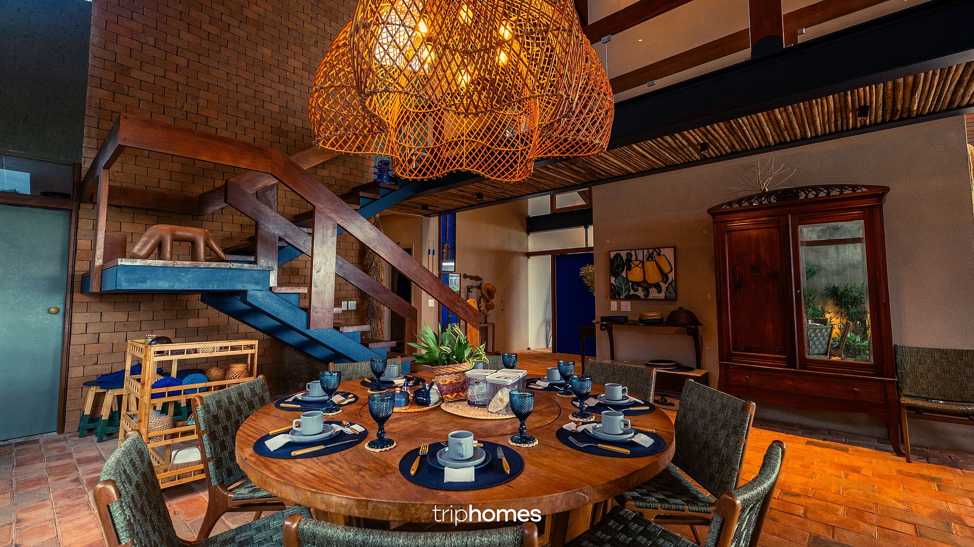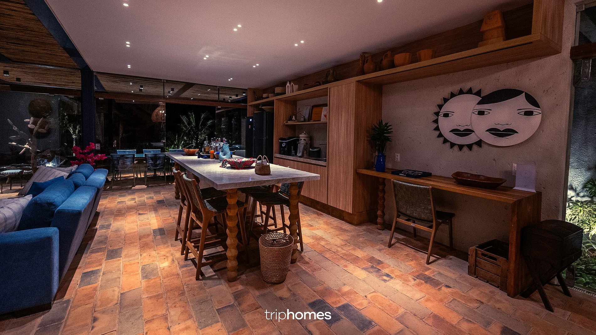The main house, meanwhile, is the social heart of the villa. Its outdoor gourmet area stands out for its swimming pool with waterfall that runs along the side of the house, reaching the center of the space framed by a hydromassage, creating an amazing visual. Furnished with sofas, hammocks, chairs and tables for large groups, the area becomes a real tropical lounge, ideal for get-togethers. A large parasol, portable barbecue and ping-pong table complete the leisure area. The integrated support kitchen has an induction cooktop, brewer, fridge, ice machine and an island with high stools made of nautical rope, as well as a charming coffee table.