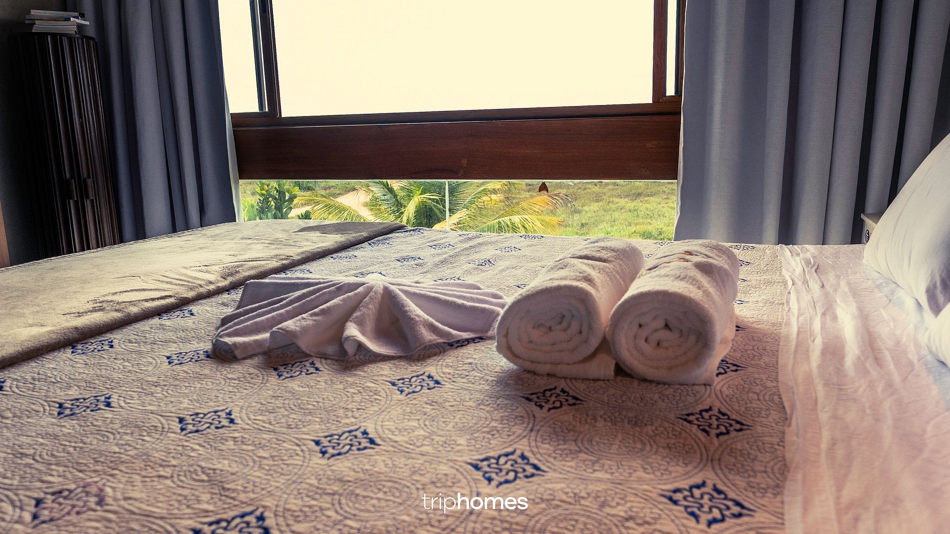 At the entrance, a large private parking lot with capacity for up to eight vehicles welcomes guests, leading to the main area of the villa. The two bungalows were designed with a focus on well-being and functionality. On the first floor, each unit has an air-conditioned living room with comfortable armchairs and sofas, integrated into the dining room with a table for six. The kitchen, which is practical and equipped with a fridge, stove and water filter, efficiently meets daily needs. On the same floor, a bedroom with two single beds, a bench and an external clothesline offers practicality, while the guest bathroom serves this wing conveniently.