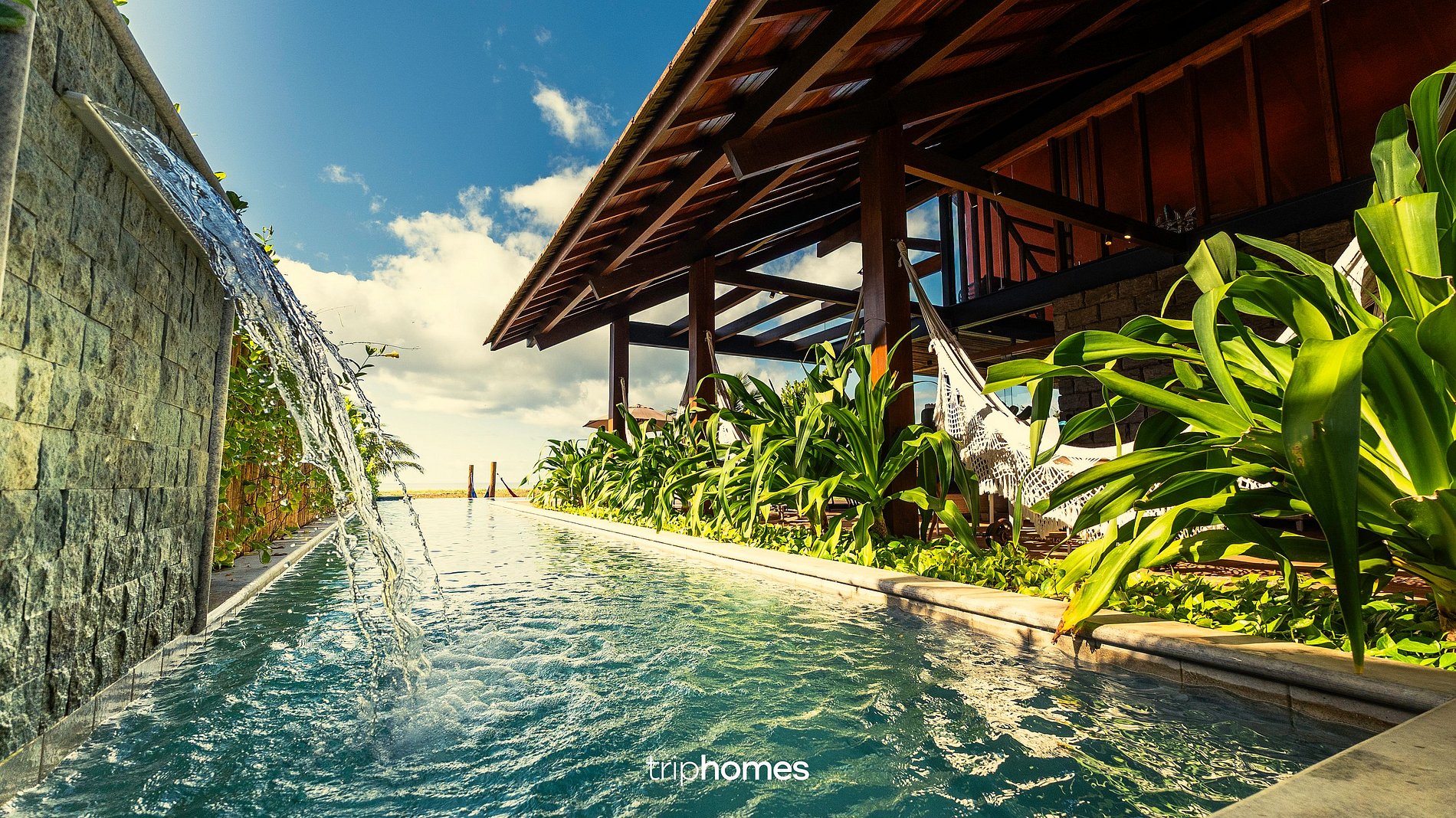 The main house, meanwhile, is the social heart of the villa. Its outdoor gourmet area stands out for its swimming pool with waterfall that runs along the side of the house, reaching the center of the space framed by a hydromassage, creating an amazing visual. Furnished with sofas, hammocks, chairs and tables for large groups, the area becomes a real tropical lounge, ideal for get-togethers. A large parasol, portable barbecue and ping-pong table complete the leisure area. The integrated support kitchen has an induction cooktop, brewer, fridge, ice machine and an island with high stools made of nautical rope, as well as a charming coffee table.