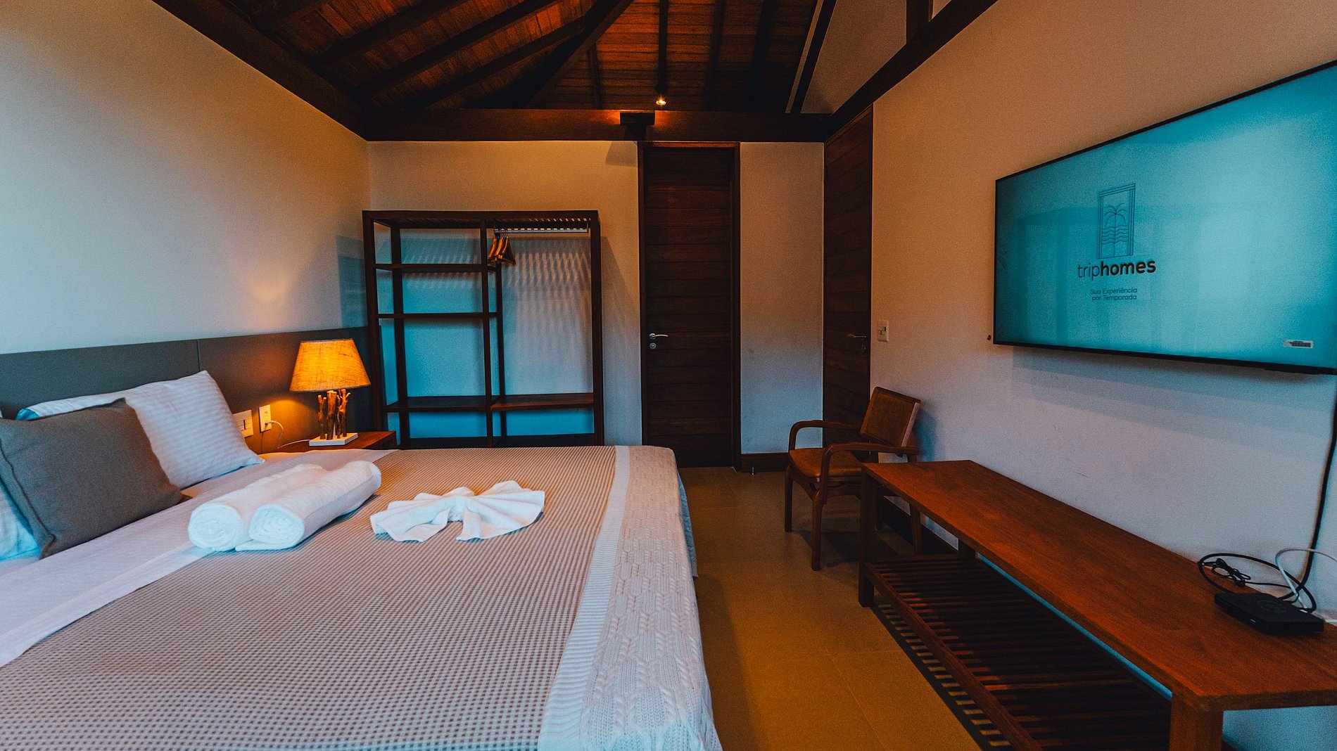 Each house in the complex offers spacious, integrated environments designed for well-being and conviviality. The gourmet areas are inviting, with round tables surrounded by nautical rope chairs and organically shaped pools that connect naturally with the architecture of the space. The outdoor setting is complemented by sun loungers, sofas and umbrellas that transform each leisure area into an invitation to relax. Inside, the living rooms have generous sofas, comfortable armchairs, soft décor and state-of-the-art televisions, creating a cozy atmosphere to bring everyone together for moments of relaxation. The dining rooms, also spacious, connect to the full kitchens, equipped with modern appliances such as an air fryer, vertical freezer, microwave, water dispenser and five-burner stove.
