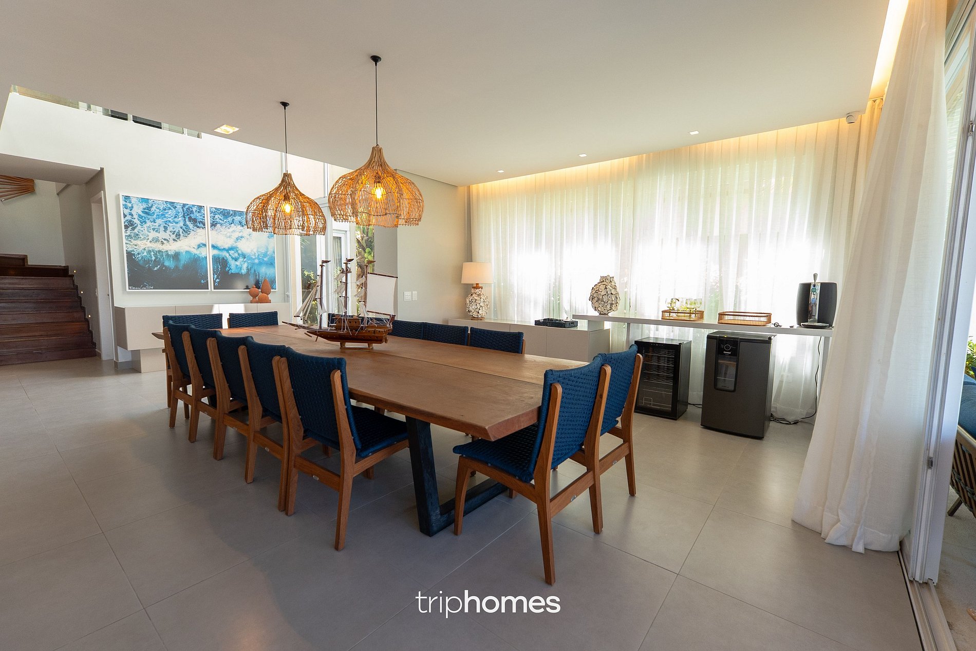 In the intimate area, the mansion comfortably accommodates large groups in its six air-conditioned suites. The ground floor suite has a queen bed and a functional structure. Upstairs, five additional suites guarantee versatility and comfort, with queen beds, single beds with auxiliary supports, cribs and spaces ranging from 4 to 6 guests per room. The Master Suite stands out with its king bed, work desk, private balcony with sea views and total exclusivity.