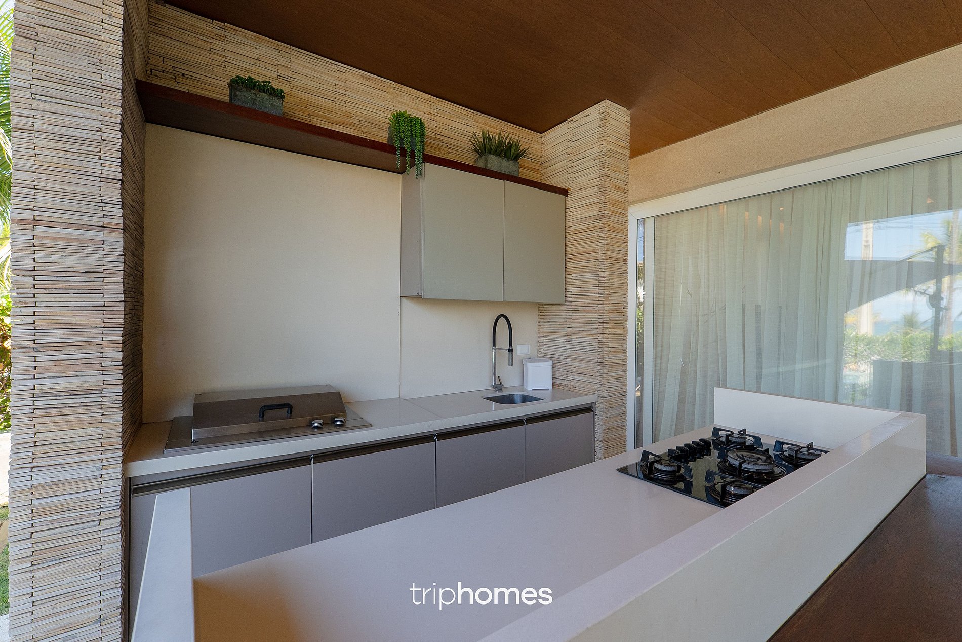 Right at the entrance, guests are greeted by an elegant outdoor area with a rectangular swimming pool, hydromassage and hammock, surrounded by sun loungers, sofas and cozy lounges. The integrated gourmet area has an island equipped with a five-burner cooktop, an American barbecue, a round table for eight and sophistication in every detail.