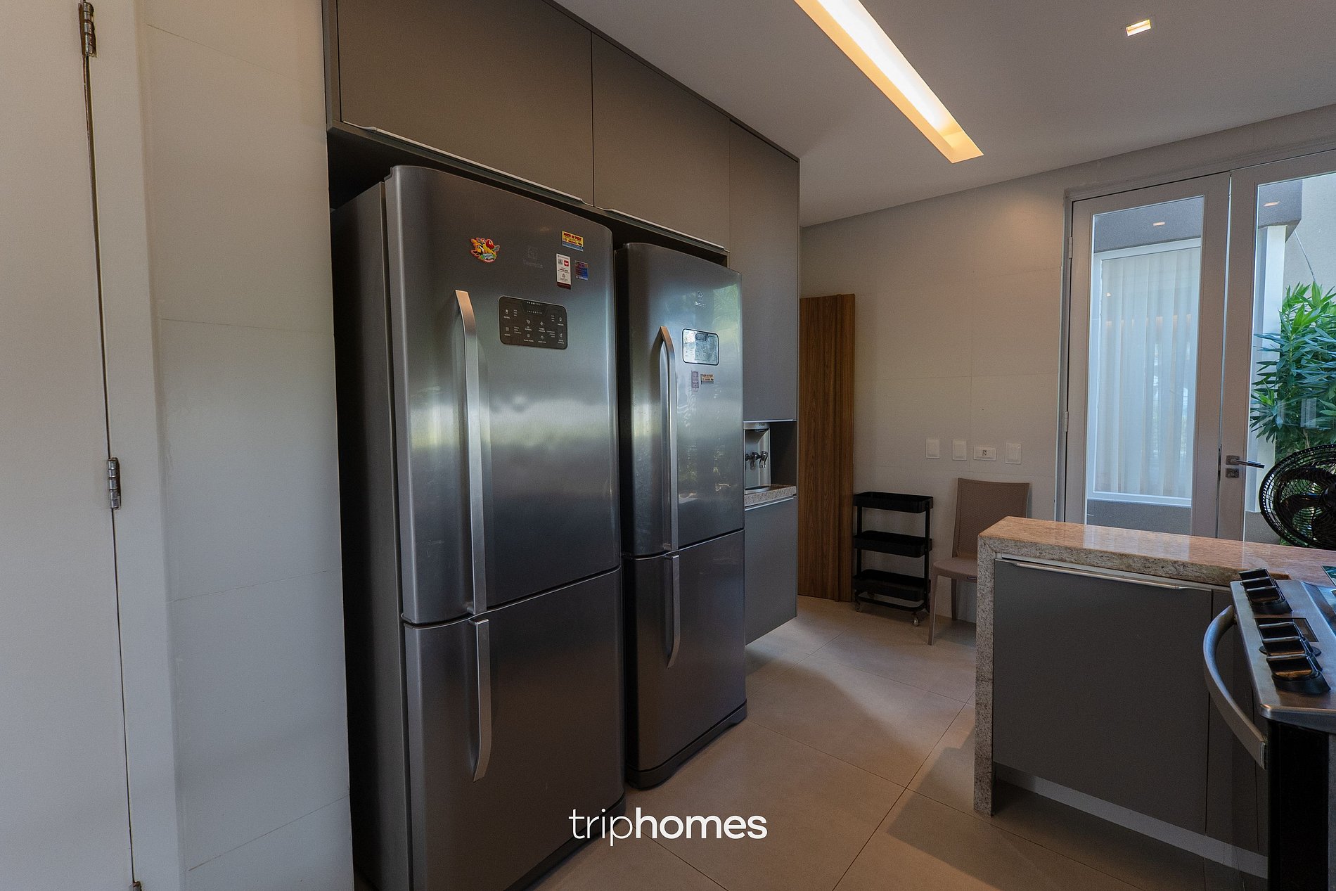 Inside, the social area consists of a living room with an L-shaped sofa for up to seven people, a 70" TV and JBL stereo, which is integrated into the dining room with a table for 14. The fully equipped kitchen has two fridges, a stove with oven, microwave, blender, airfryer and water dispenser, as well as a laundry area with an upright freezer and washing machine.