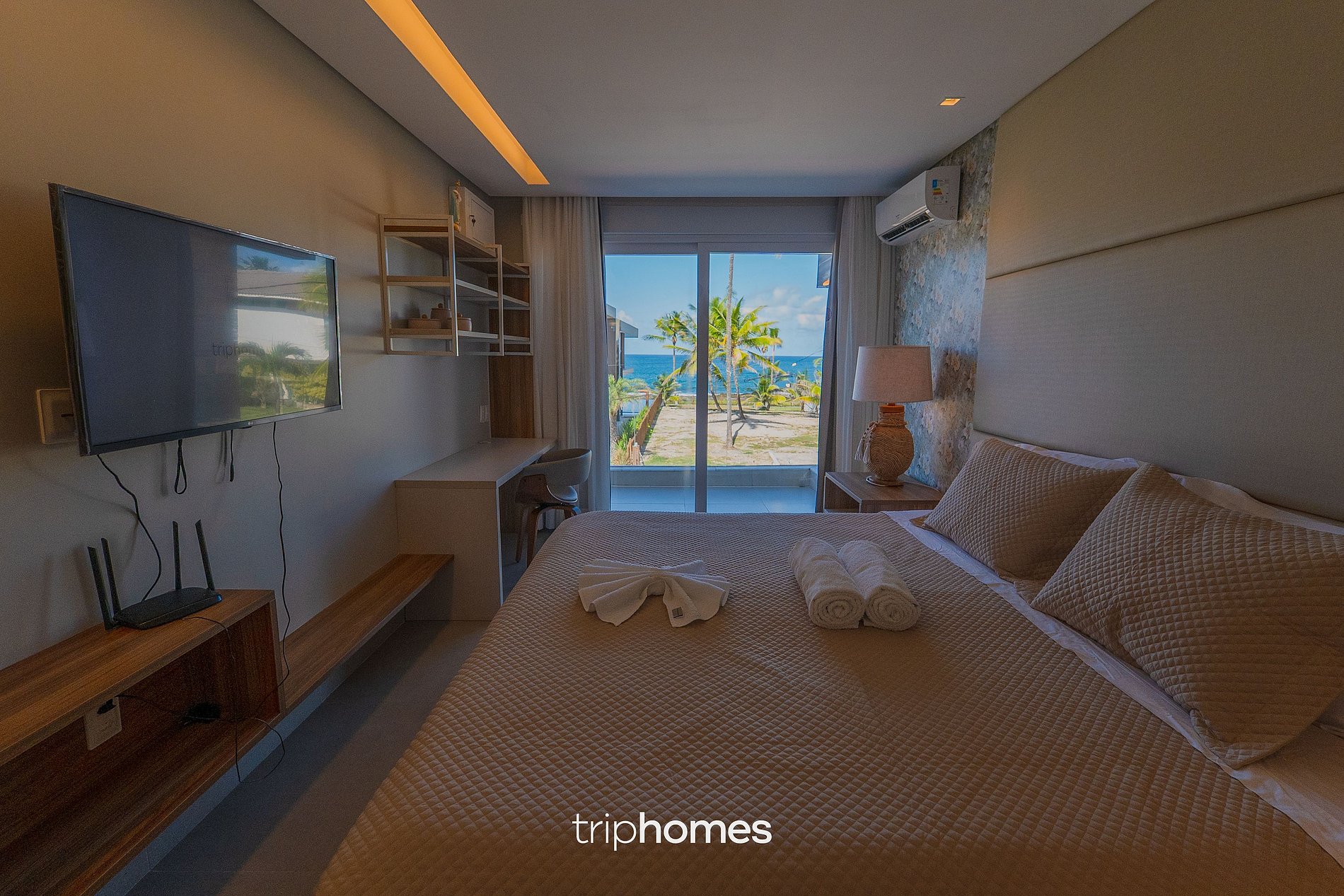 In the intimate area, the mansion comfortably accommodates large groups in its six air-conditioned suites. The ground floor suite has a queen bed and a functional structure. Upstairs, five additional suites guarantee versatility and comfort, with queen beds, single beds with auxiliary supports, cribs and spaces ranging from 4 to 6 guests per room. The Master Suite stands out with its king bed, work desk, private balcony with sea views and total exclusivity.