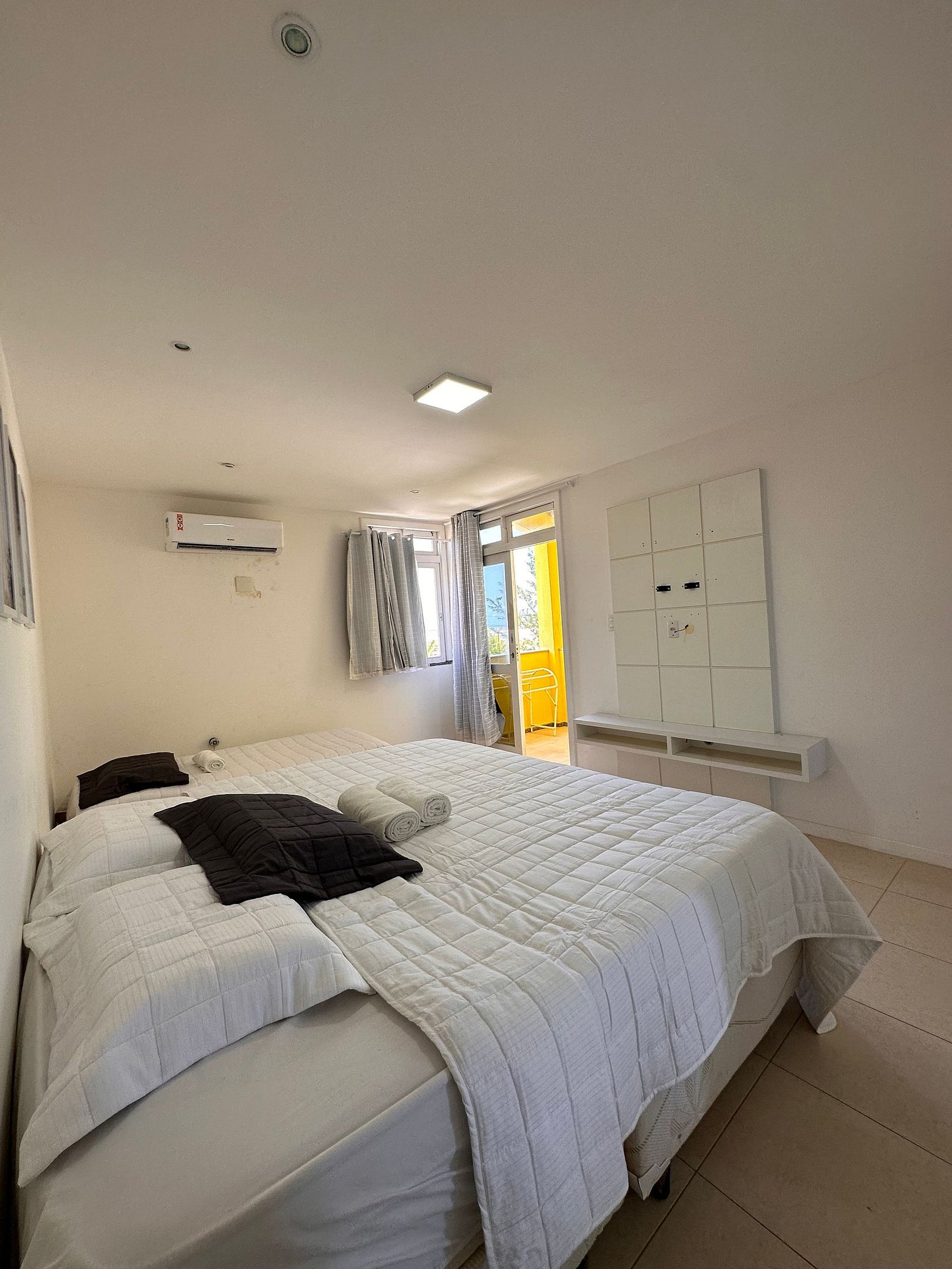 4 suites with air conditioning and balcony facing the sea, double beds with sheets, blankets and pillows, dressers and supports for storing clothes.