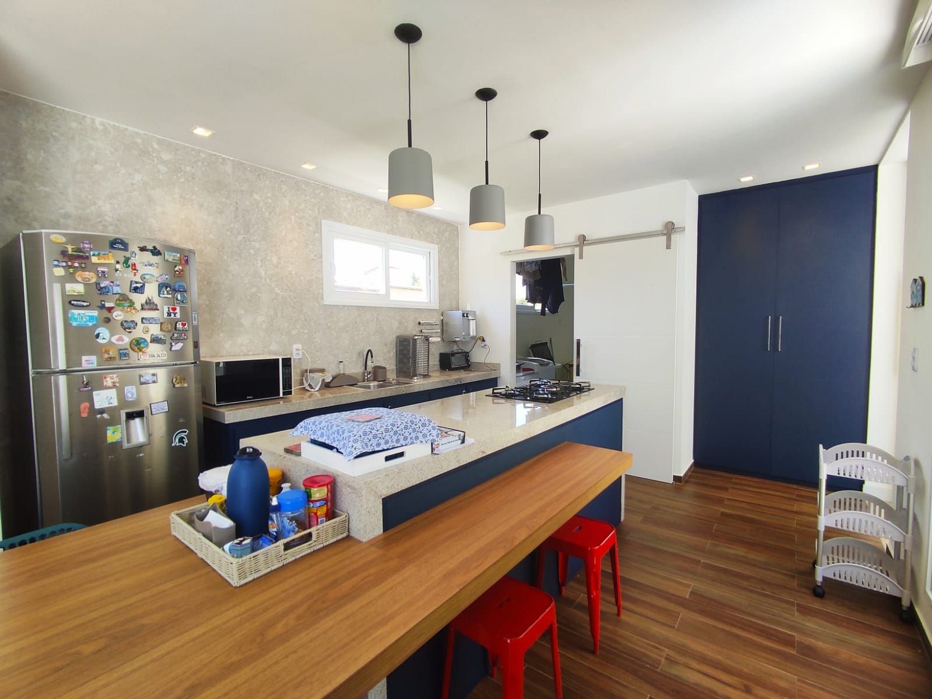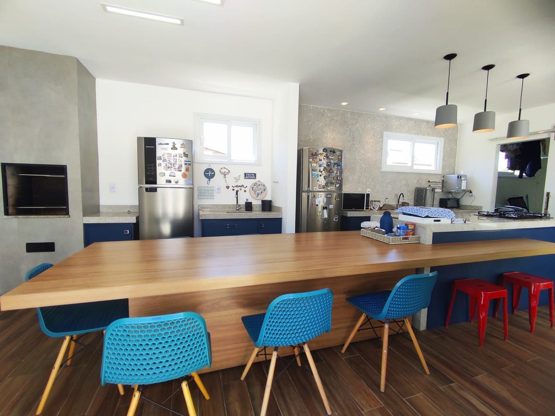 Cozinha completa com eletrodomésticos e utensílios para preparar refeições, mesas e cadeiras para toda a família.