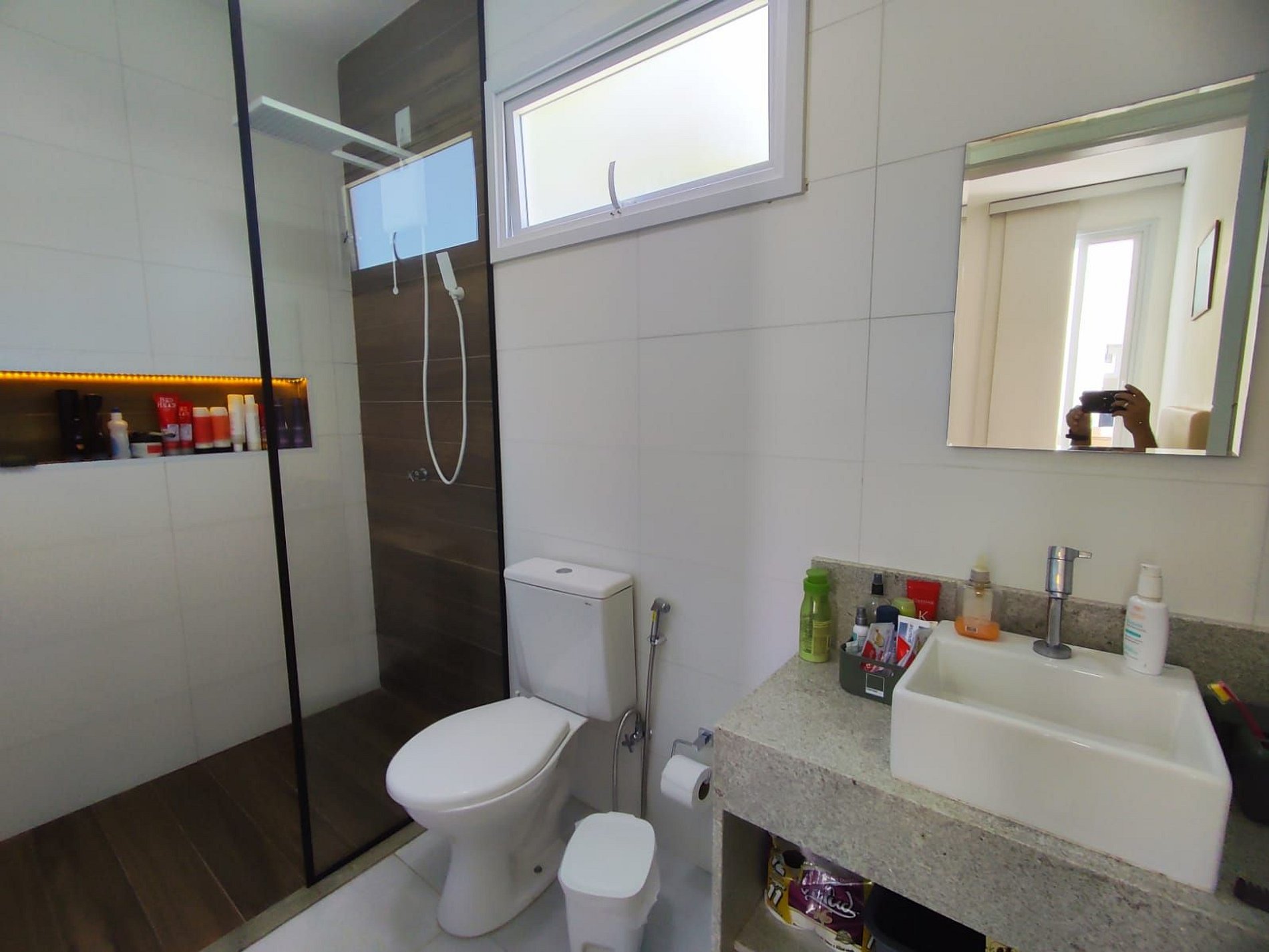 Estrutura à base de mármore e granito escovado, espaços integrados com portas de correr feitas de vidros espelhados.