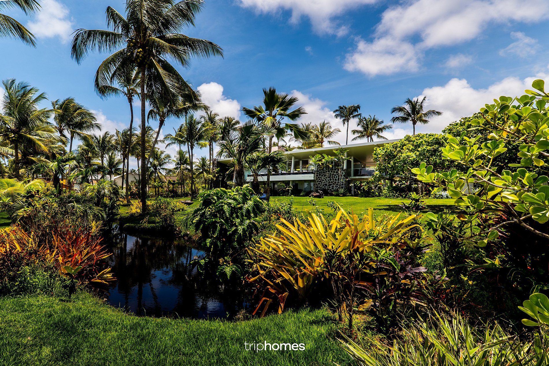 Paisajismo con cocoteros, parterres, estanque ornamental e iluminación empotrada.