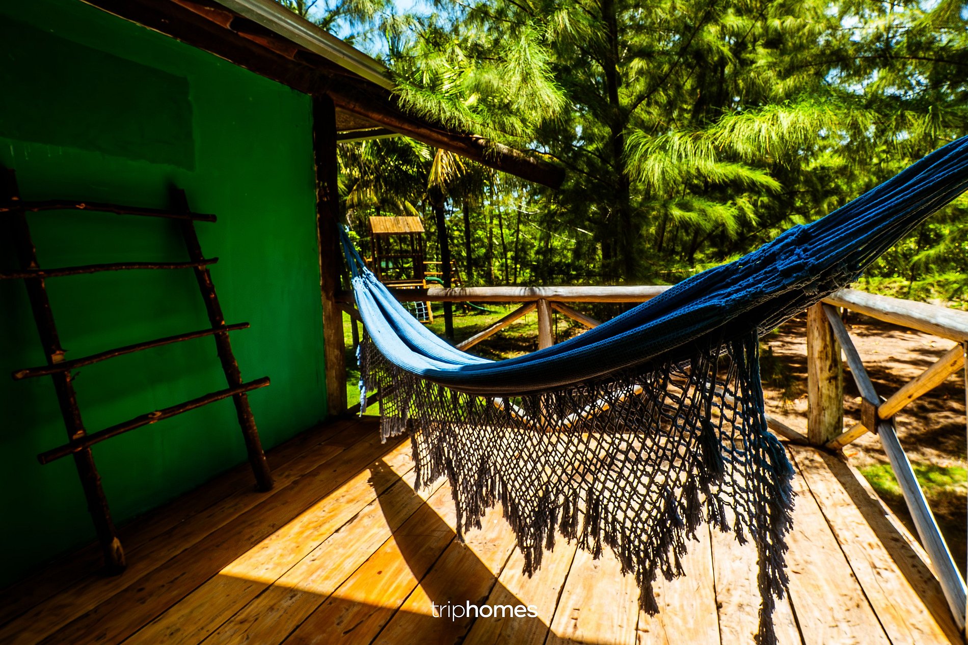 La zona cuenta con columpios de madera, bancos rústicos con cojines, una mesa larga de madera, esterillas de meditación, siete cojines, cuatro tumbonas y cuatro hamacas.