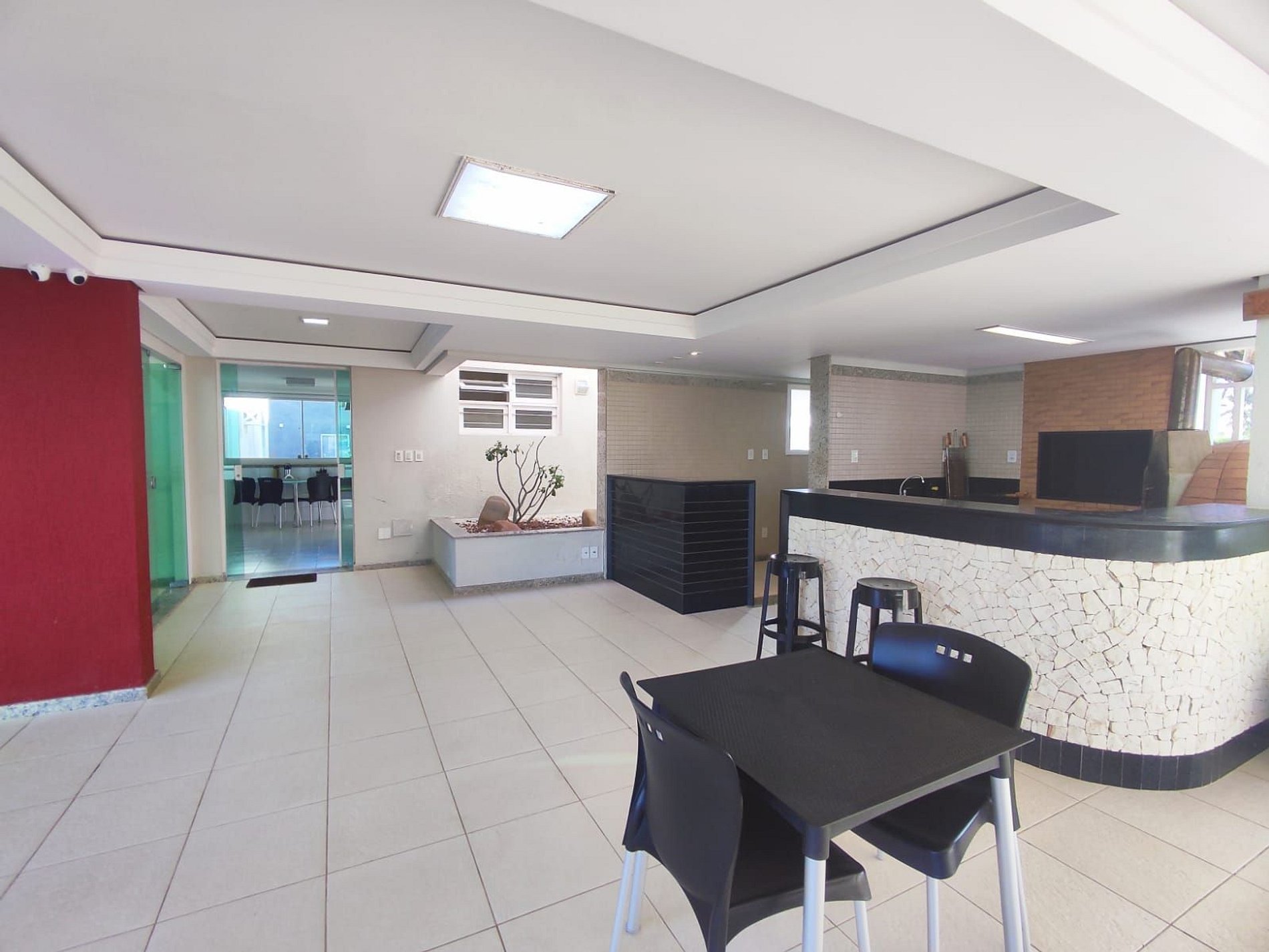 Área de lazer com piscina grande deck de madeira, espreguiçadeiras, churrasqueira gourmet.