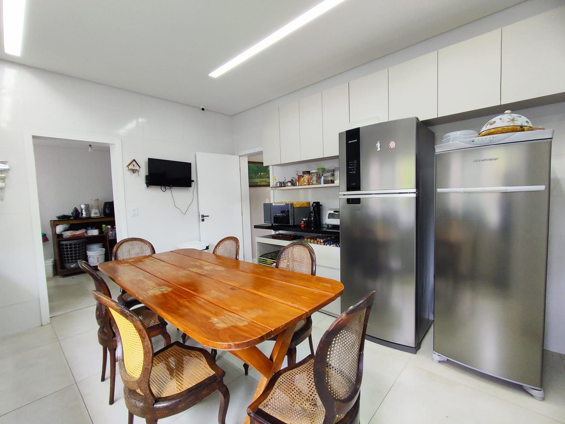 Cozinha completa com eletrodomésticos e utensílios para preparar e servir refeições, mesas e cadeiras para toda a família.