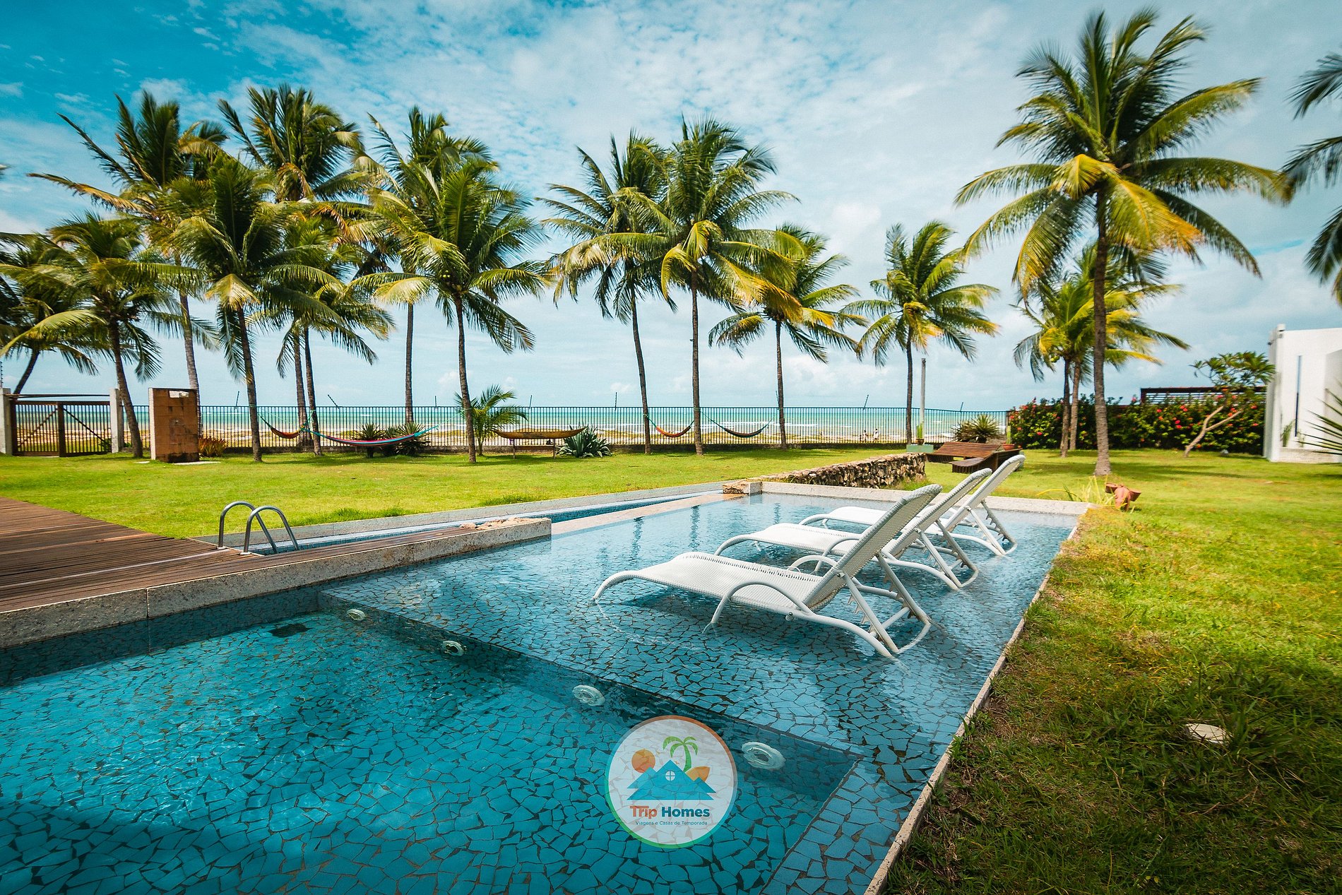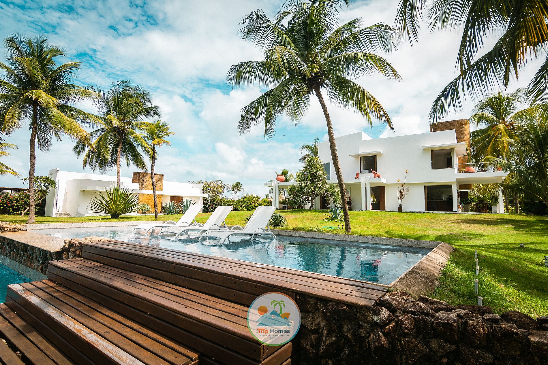 La mansión se abre a uno de los paisajes más impresionantes de la costa norte de Alagoas: las piscinas naturales de Paripueira, la arena clara que se extiende por kilómetros y el mar tranquilo en tonos azules suaves. El jardín tropical, marcado por altos cocoteros y un amplio césped bañado por la brisa del océano, crea una transición orgánica entre la casa y la línea del horizonte. La arquitectura es el punto central de la experiencia. El volumen blanco, geométrico y contemporáneo revela un estilo inspirado en el Mediterráneo tropical: líneas limpias, curvas suaves, grandes planos de vidrio y balcones profundos que filtran la luz y enmarcan el paisaje. Cada abertura parece haber sido diseñada para captar la intensa claridad de Paripueira, creando interiores luminosos, fluidos y naturalmente ventilados. La sala principal, marcada por su doble altura, transmite ligereza y amplitud. Elementos naturales, como la madera y las plantas interiores, dialogan con el exterior, reforzando la sensación de continuidad entre la casa y el jardín. La escalera flotante, el suelo claro y la paleta neutra revelan una estética minimalista, delicada y sofisticada. En el exterior, la piscina de líneas rectas acompaña el lenguaje arquitectónico. Rodeada por una terraza de madera y situada frente al mar, se convierte en escenario de momentos de contemplación, ya sea al amanecer reflejado en el agua o al atardecer, cuando el cielo adquiere tonos dorados. El gran césped tropical, salpicado de palmeras inclinadas por el viento, refuerza el carácter natural de la propiedad. Cada paseo hacia la playa revela la fuerza del paisaje: mar en calma, arena fina, piscinas naturales y el silencio característico de Paripueira. Es un refugio de arquitectura elegante, naturaleza generosa y atmósfera mediterránea, perfecto para quienes buscan belleza, luz, espacio y la firma Trip Homes frente al mar.