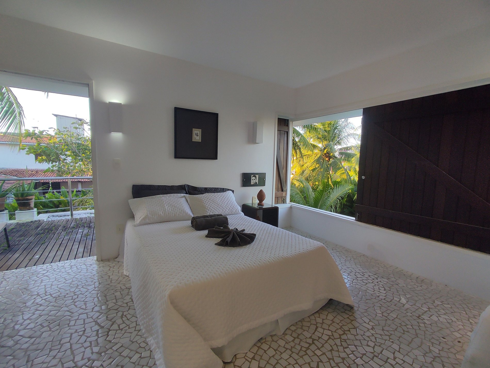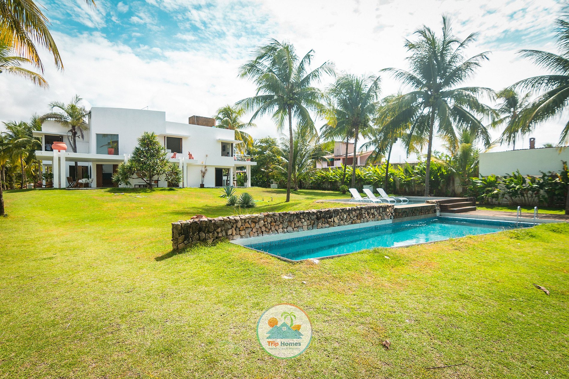 La mansión se abre a uno de los paisajes más impresionantes de la costa norte de Alagoas: las piscinas naturales de Paripueira, la arena clara que se extiende por kilómetros y el mar tranquilo en tonos azules suaves. El jardín tropical, marcado por altos cocoteros y un amplio césped bañado por la brisa del océano, crea una transición orgánica entre la casa y la línea del horizonte. La arquitectura es el punto central de la experiencia. El volumen blanco, geométrico y contemporáneo revela un estilo inspirado en el Mediterráneo tropical: líneas limpias, curvas suaves, grandes planos de vidrio y balcones profundos que filtran la luz y enmarcan el paisaje. Cada abertura parece haber sido diseñada para captar la intensa claridad de Paripueira, creando interiores luminosos, fluidos y naturalmente ventilados. La sala principal, marcada por su doble altura, transmite ligereza y amplitud. Elementos naturales, como la madera y las plantas interiores, dialogan con el exterior, reforzando la sensación de continuidad entre la casa y el jardín. La escalera flotante, el suelo claro y la paleta neutra revelan una estética minimalista, delicada y sofisticada. En el exterior, la piscina de líneas rectas acompaña el lenguaje arquitectónico. Rodeada por una terraza de madera y situada frente al mar, se convierte en escenario de momentos de contemplación, ya sea al amanecer reflejado en el agua o al atardecer, cuando el cielo adquiere tonos dorados. El gran césped tropical, salpicado de palmeras inclinadas por el viento, refuerza el carácter natural de la propiedad. Cada paseo hacia la playa revela la fuerza del paisaje: mar en calma, arena fina, piscinas naturales y el silencio característico de Paripueira. Es un refugio de arquitectura elegante, naturaleza generosa y atmósfera mediterránea, perfecto para quienes buscan belleza, luz, espacio y la firma Trip Homes frente al mar.