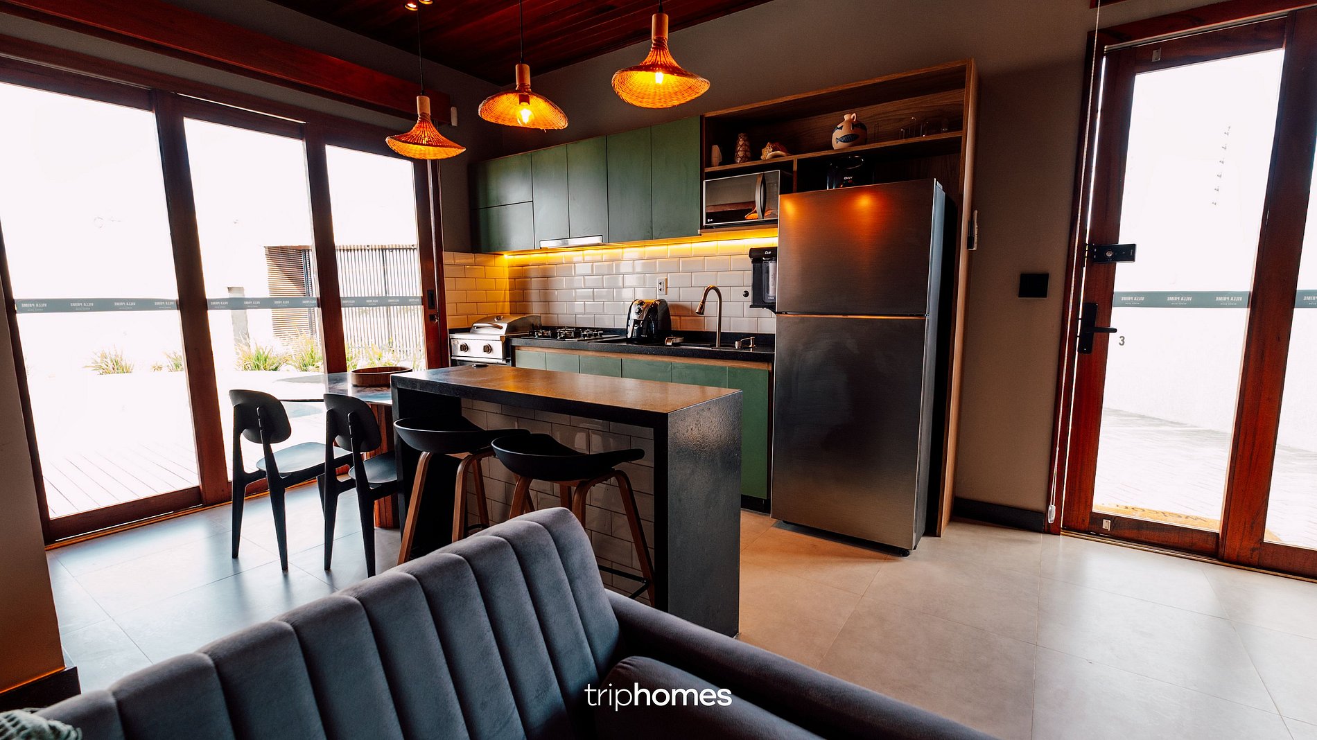 Cocina totalmente equipada: La cocina dispone de barbacoa americana, placa de 4 fuegos, airfryer, purificador de agua, microondas, frigorífico de dos puertas, batidora y sandwichera, proporcionando todas las facilidades para sus comidas.