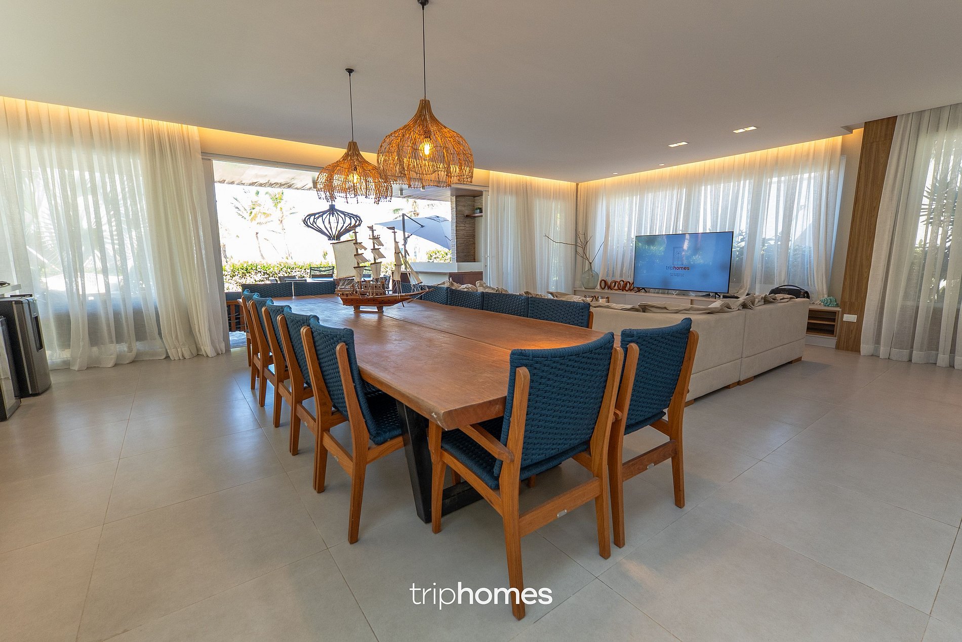 En el interior, la zona social se compone de una sala de estar con sofá en L para hasta siete personas, televisor de 70" y equipo de música JBL, que se integra en el comedor con mesa para 14 comensales. La cocina, totalmente equipada, dispone de dos frigoríficos, cocina con horno, microondas, batidora, airfryer y dispensador de agua, así como una zona de lavandería con congelador vertical y lavadora.