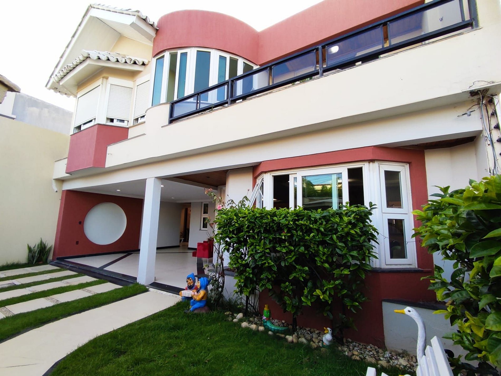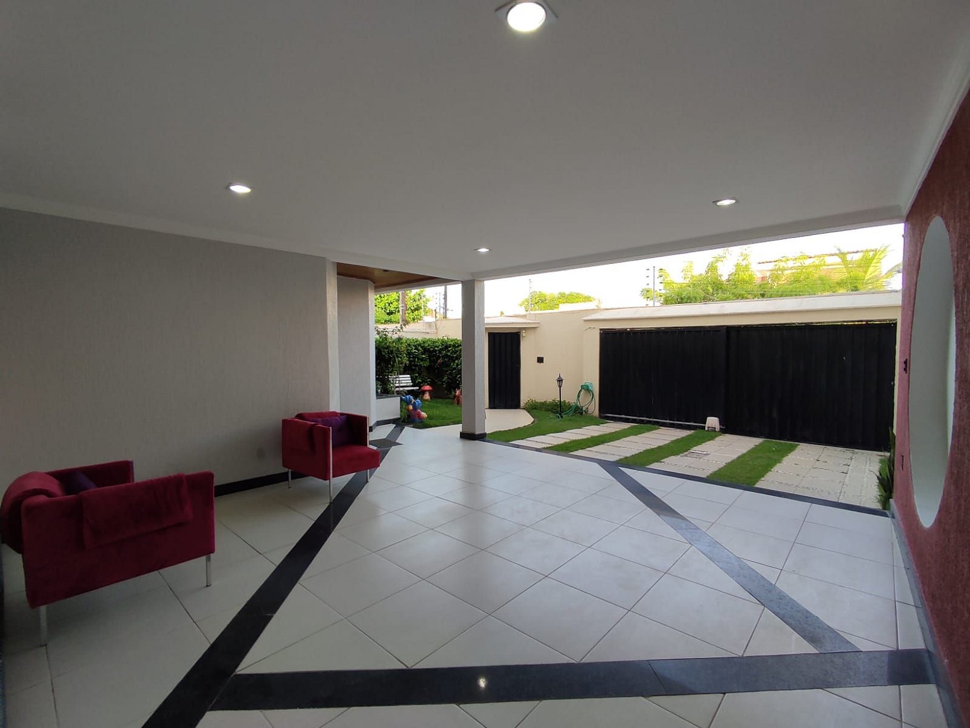Garagem para 4 carros, casa muitos segura com muro alto, portão eletrônico e câmeras de segurança externas.