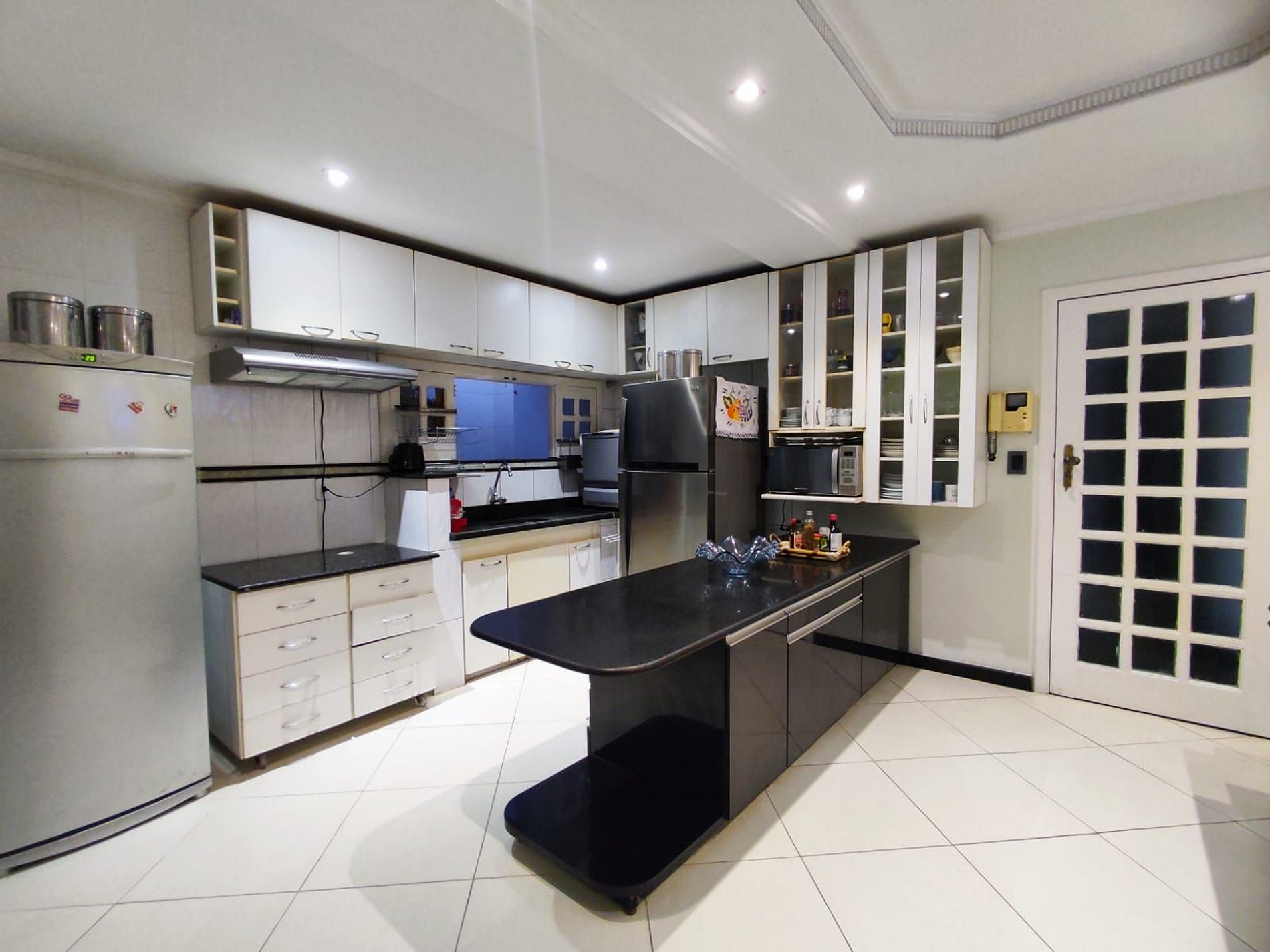 Cozinha completa com geladeira, micro-ondas e utensílios para preparar refeições.