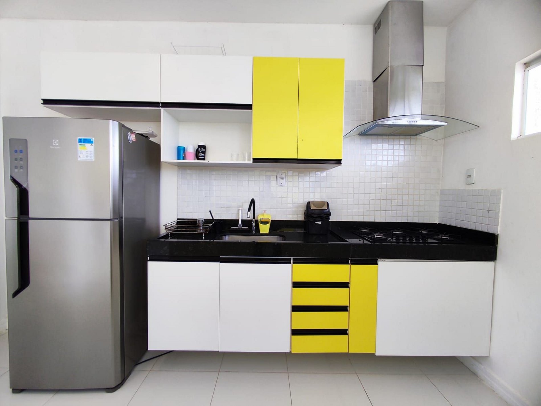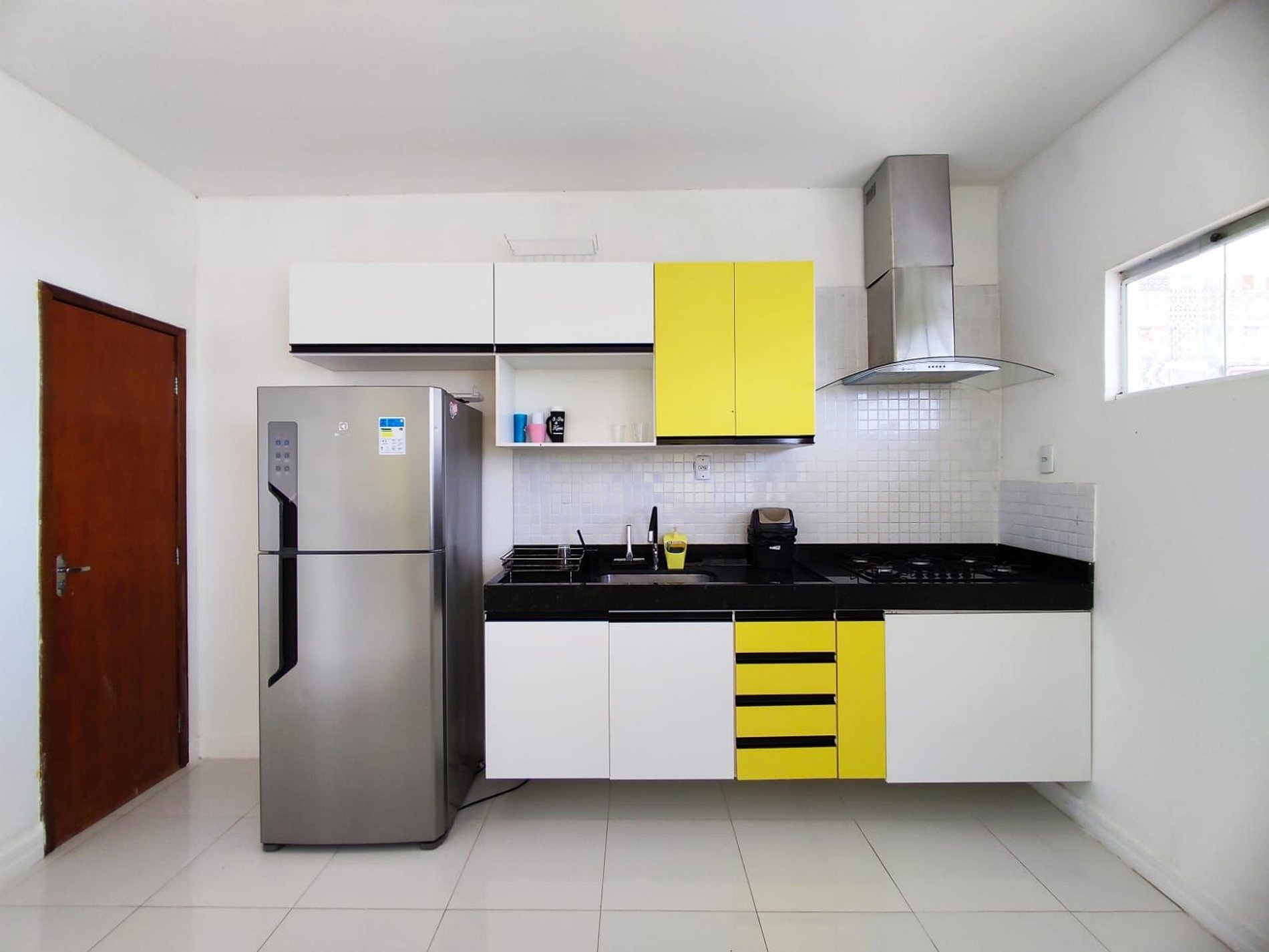 Cozinha completa com eletrodomésticos e utensílios para cozinhar.