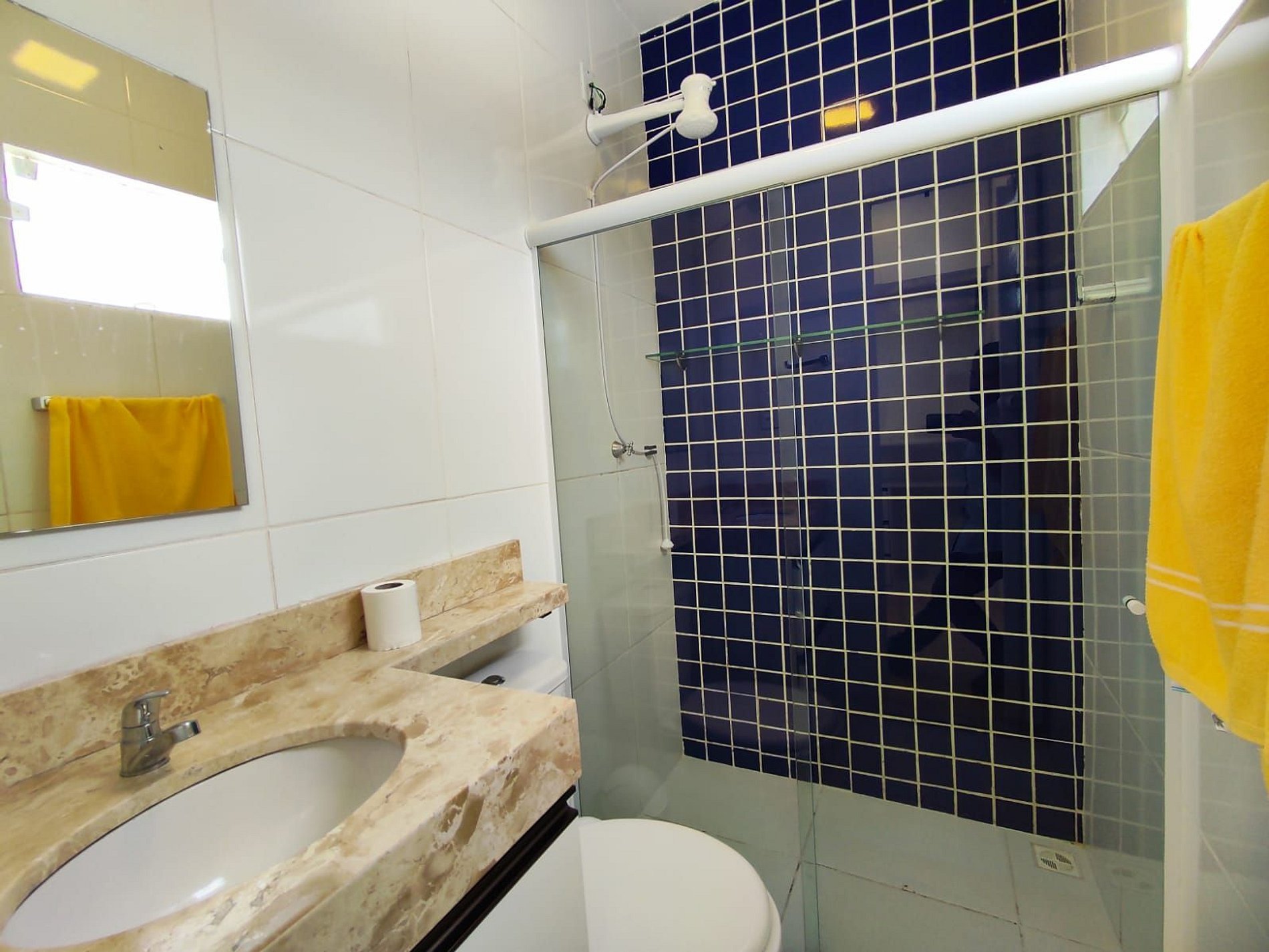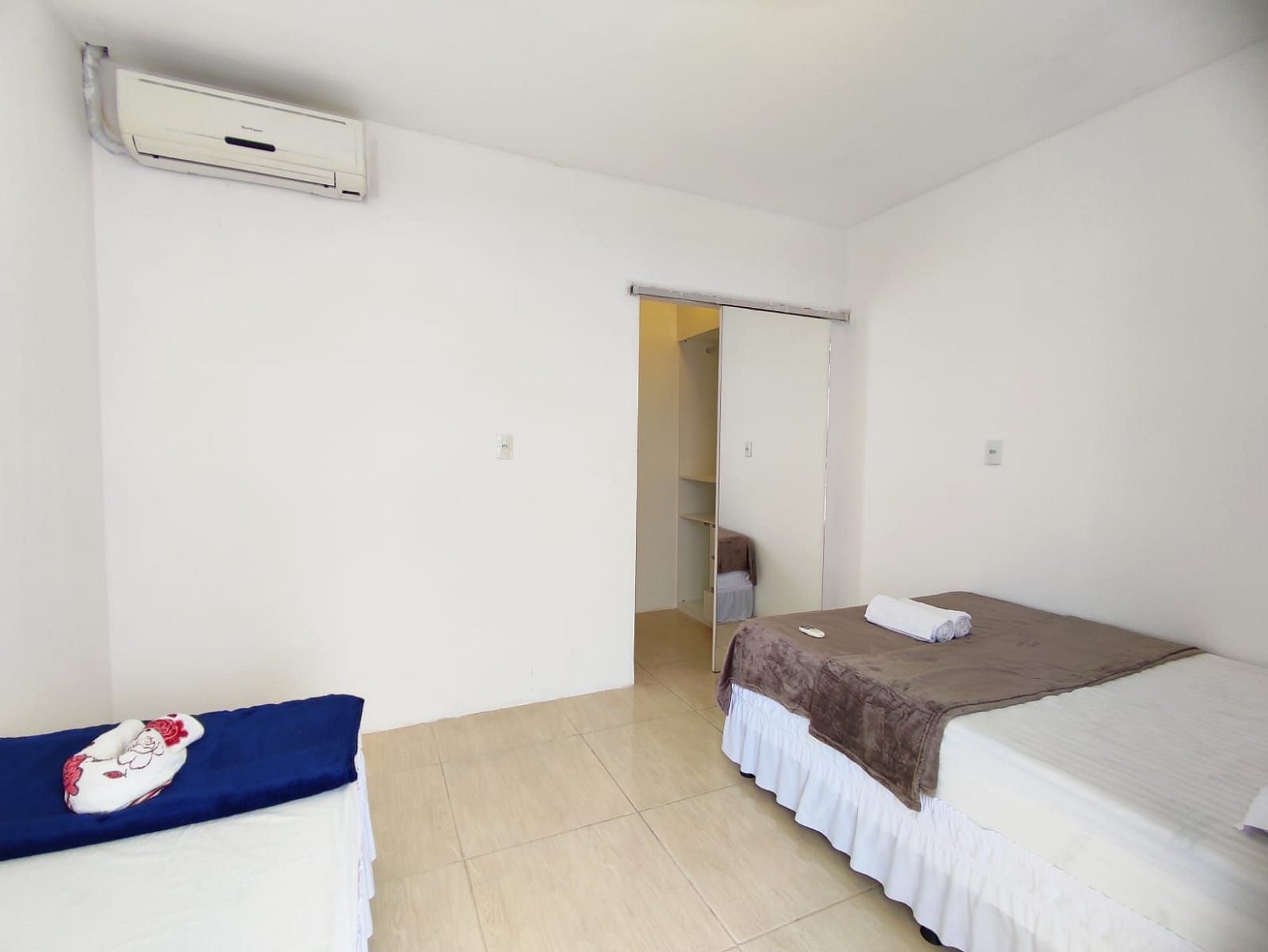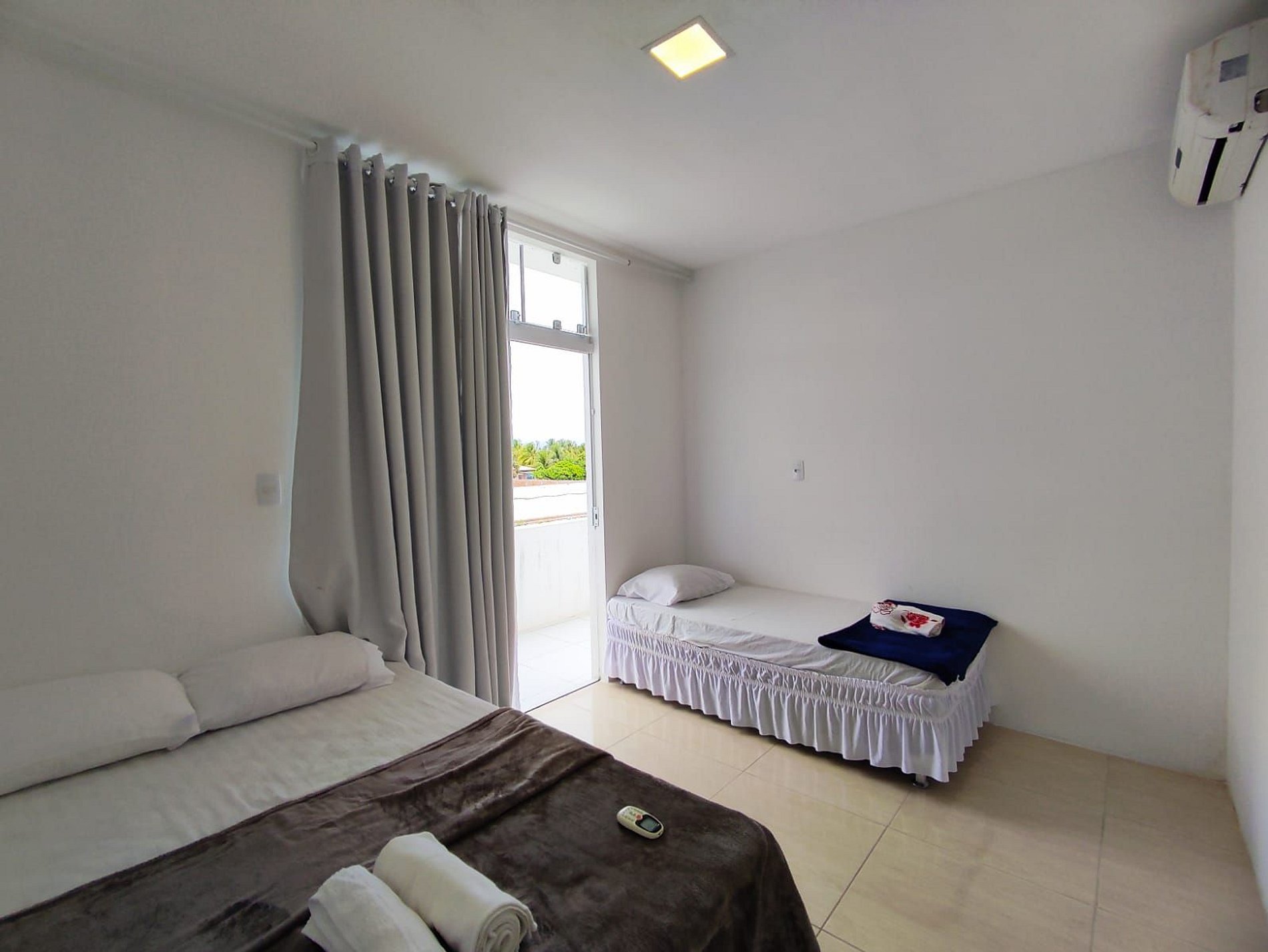 São 3 suítes aconchegantes, todos com ar condicionado, chuveiro elétrico, cama de casal, lençol, travesseiro e cobertor.