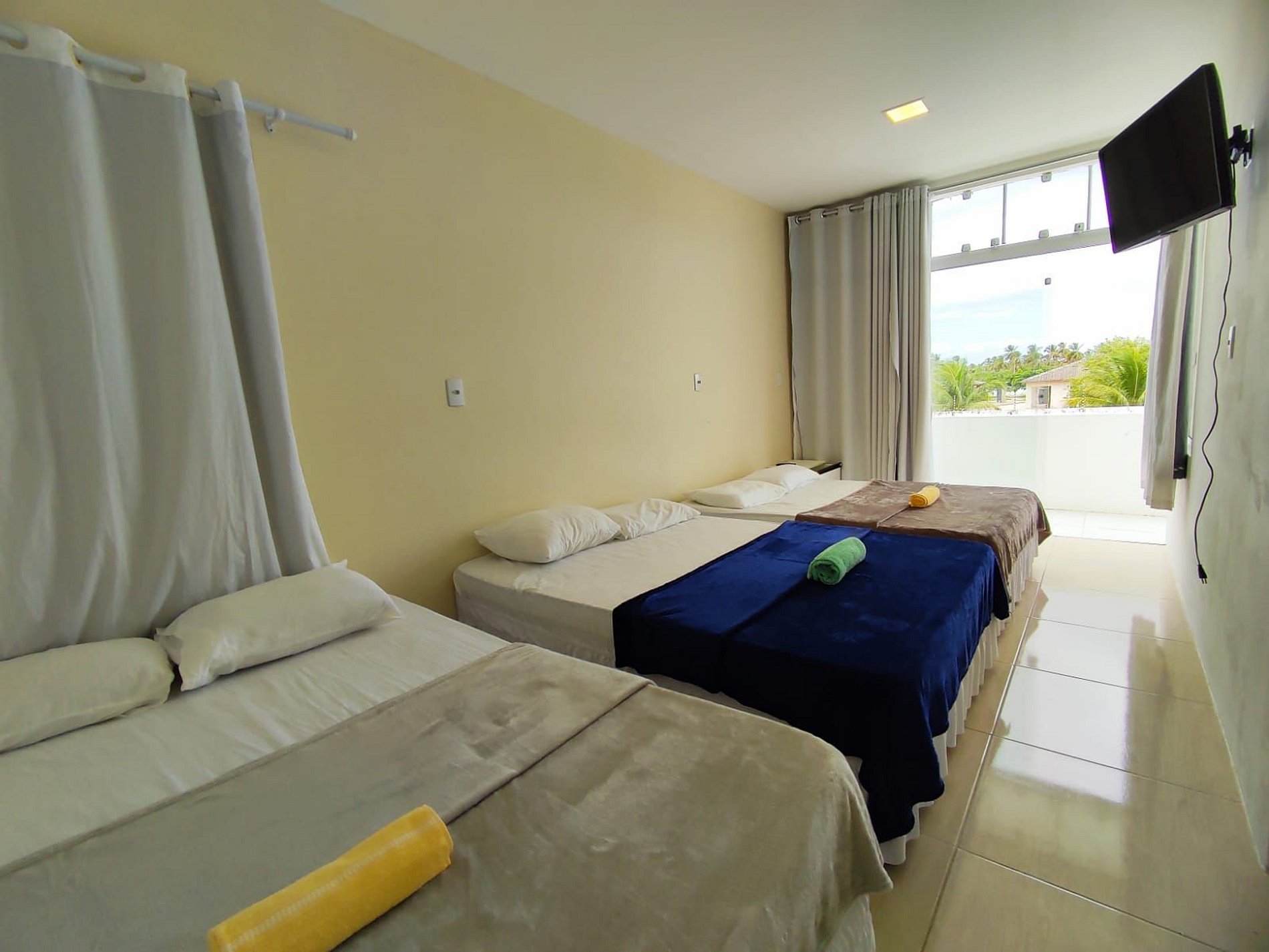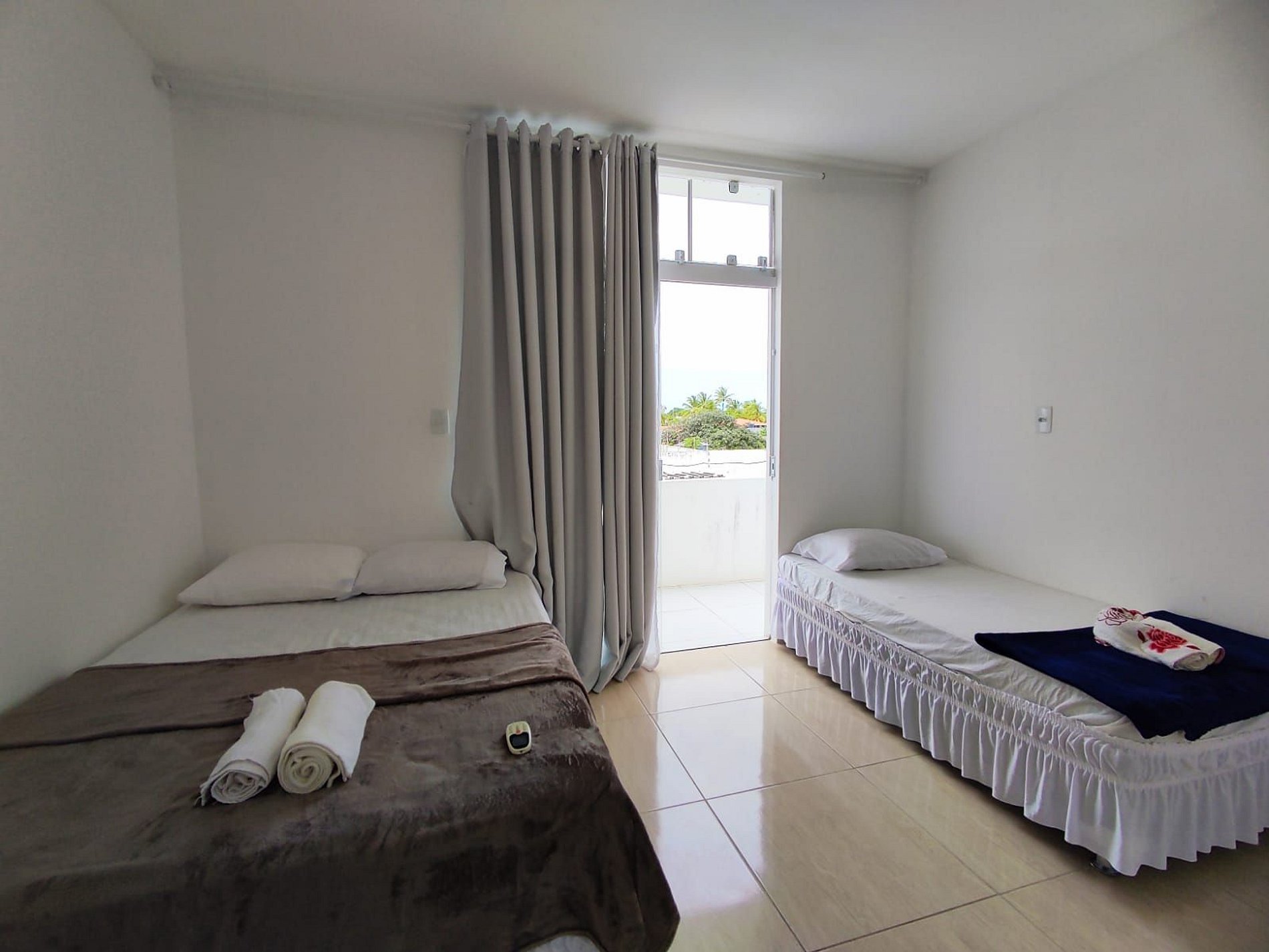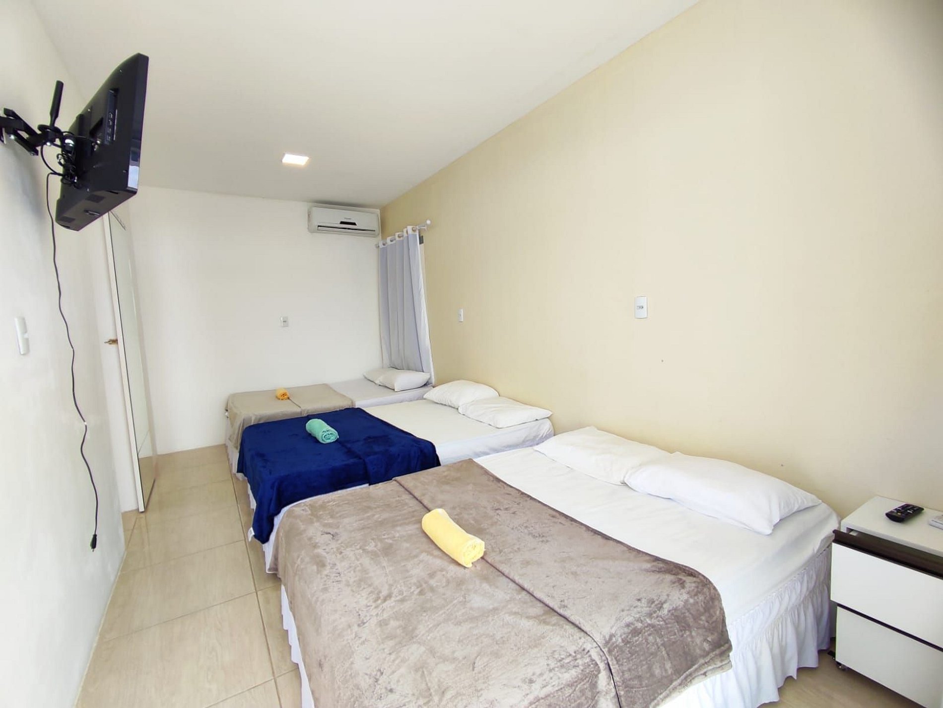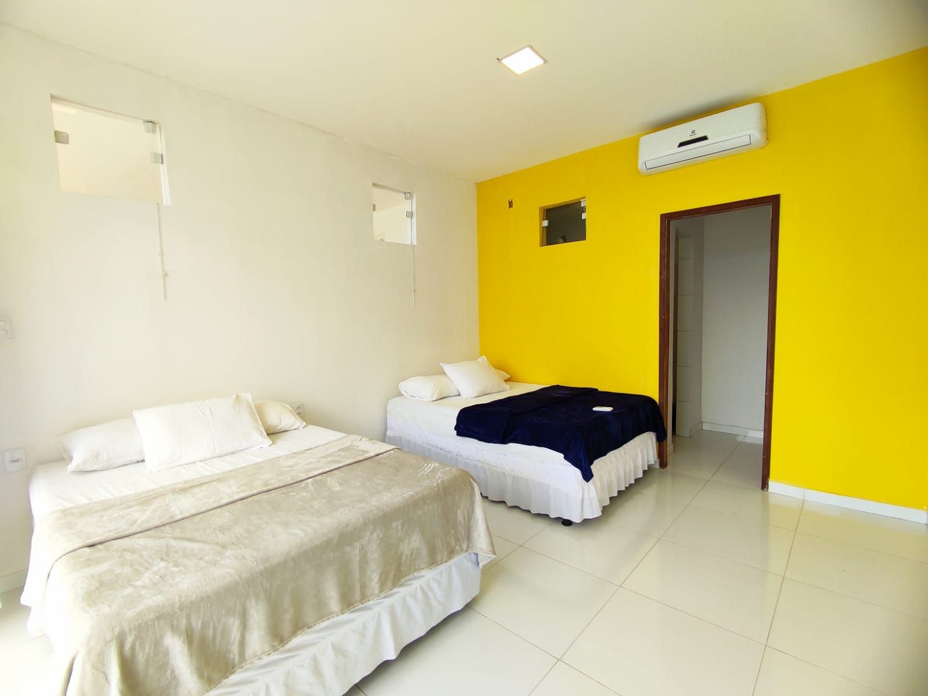 São 3 suítes aconchegantes, todos com ar condicionado, chuveiro elétrico, cama de casal, lençol, travesseiro e cobertor.