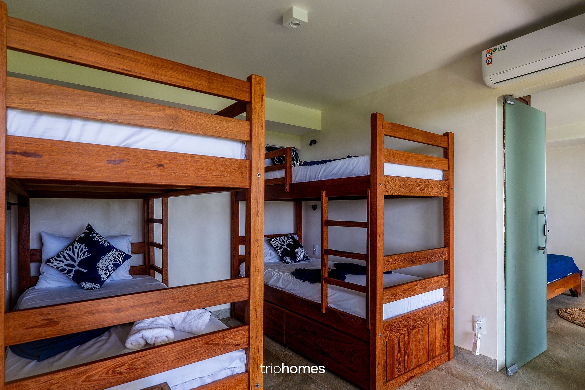 • Quarto 2: duas beliches de madeira (4 camas de solteiro), janela lateral e acesso opcional ao banheiro da Suíte 1.