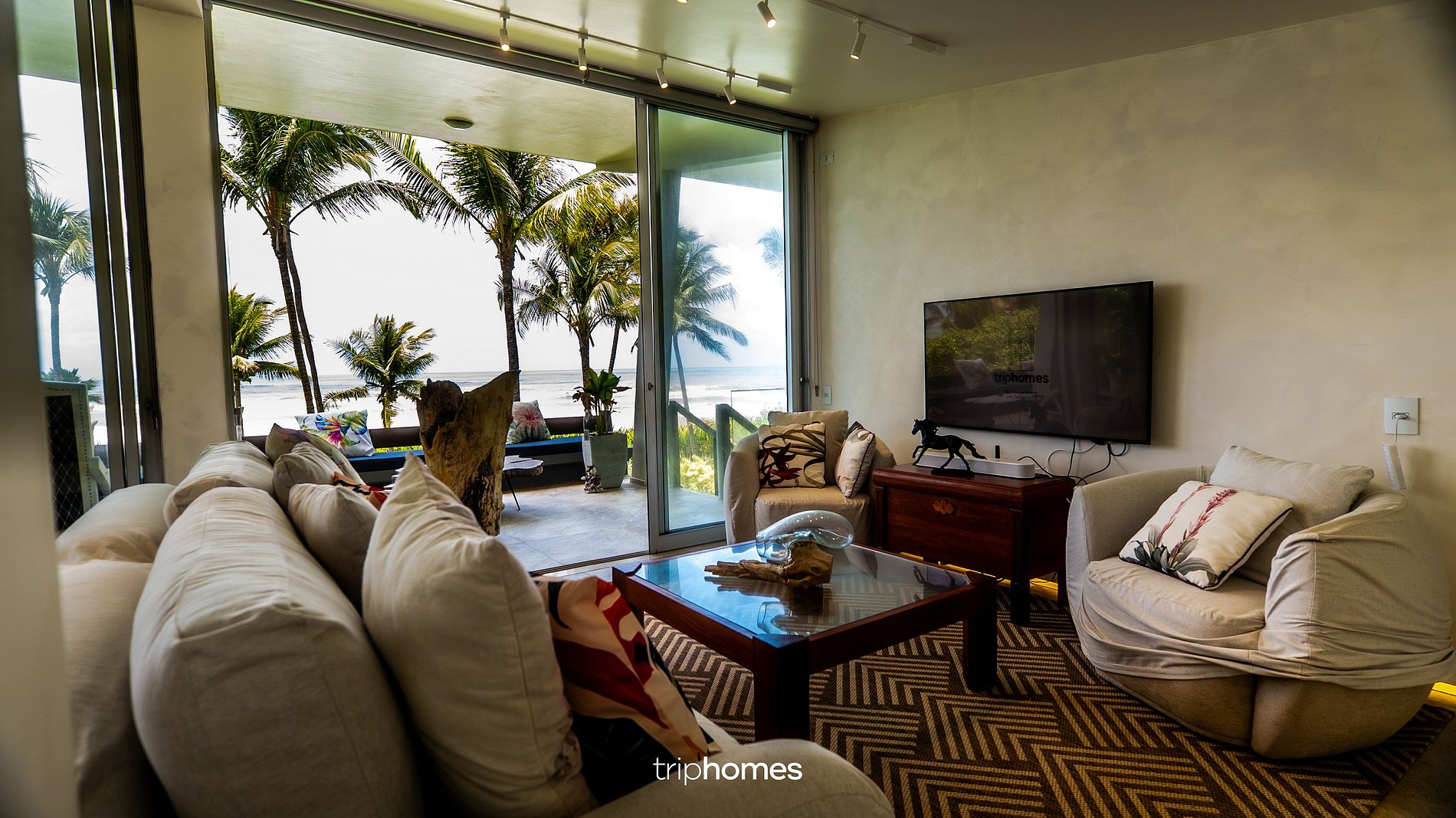 • Sala de Estar: ampla e integrada à varanda, com vista mar. Sofá para 4 pessoas, 2 poltronas, mesa de jantar para 6 lugares, área de trabalho e armário de louças.