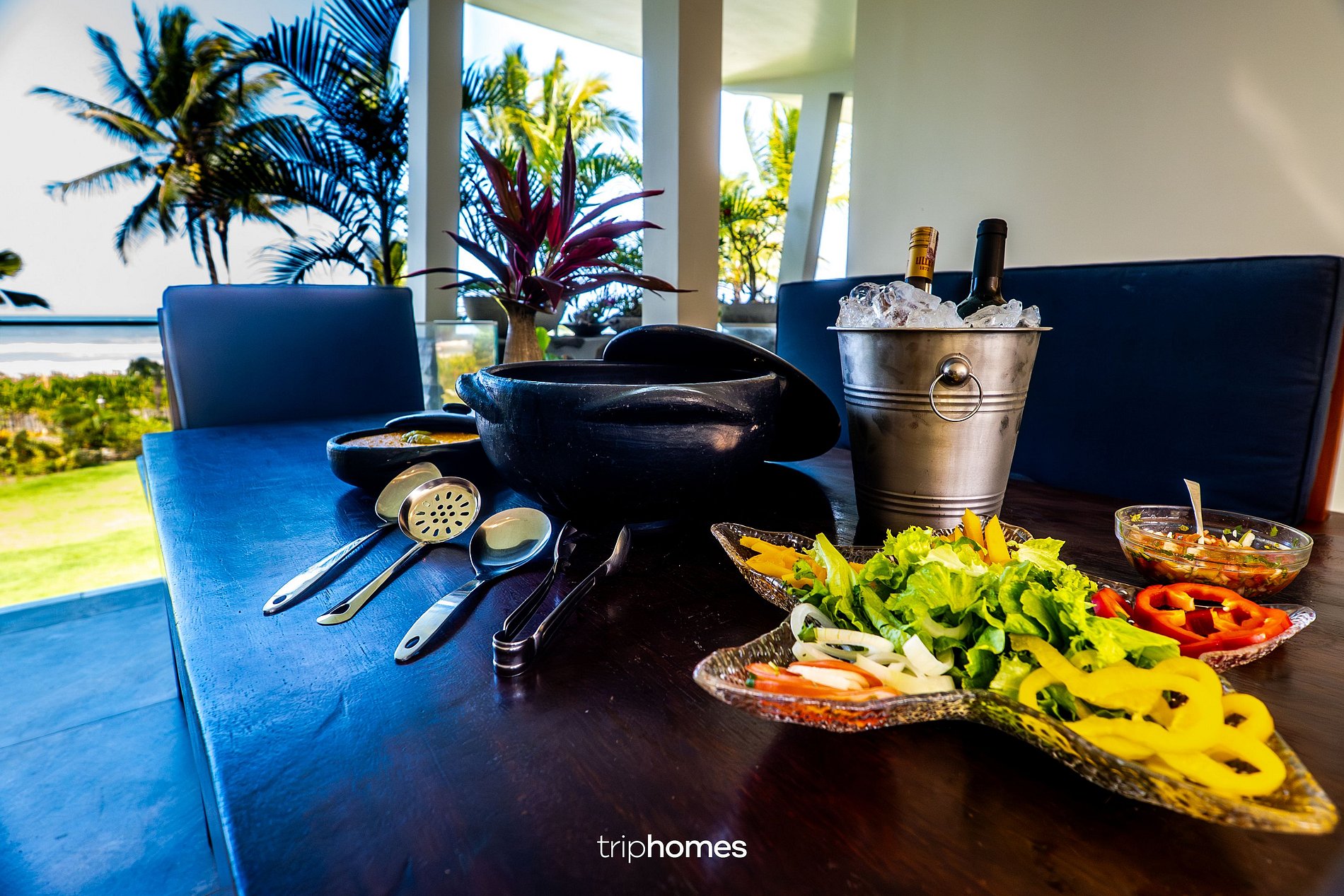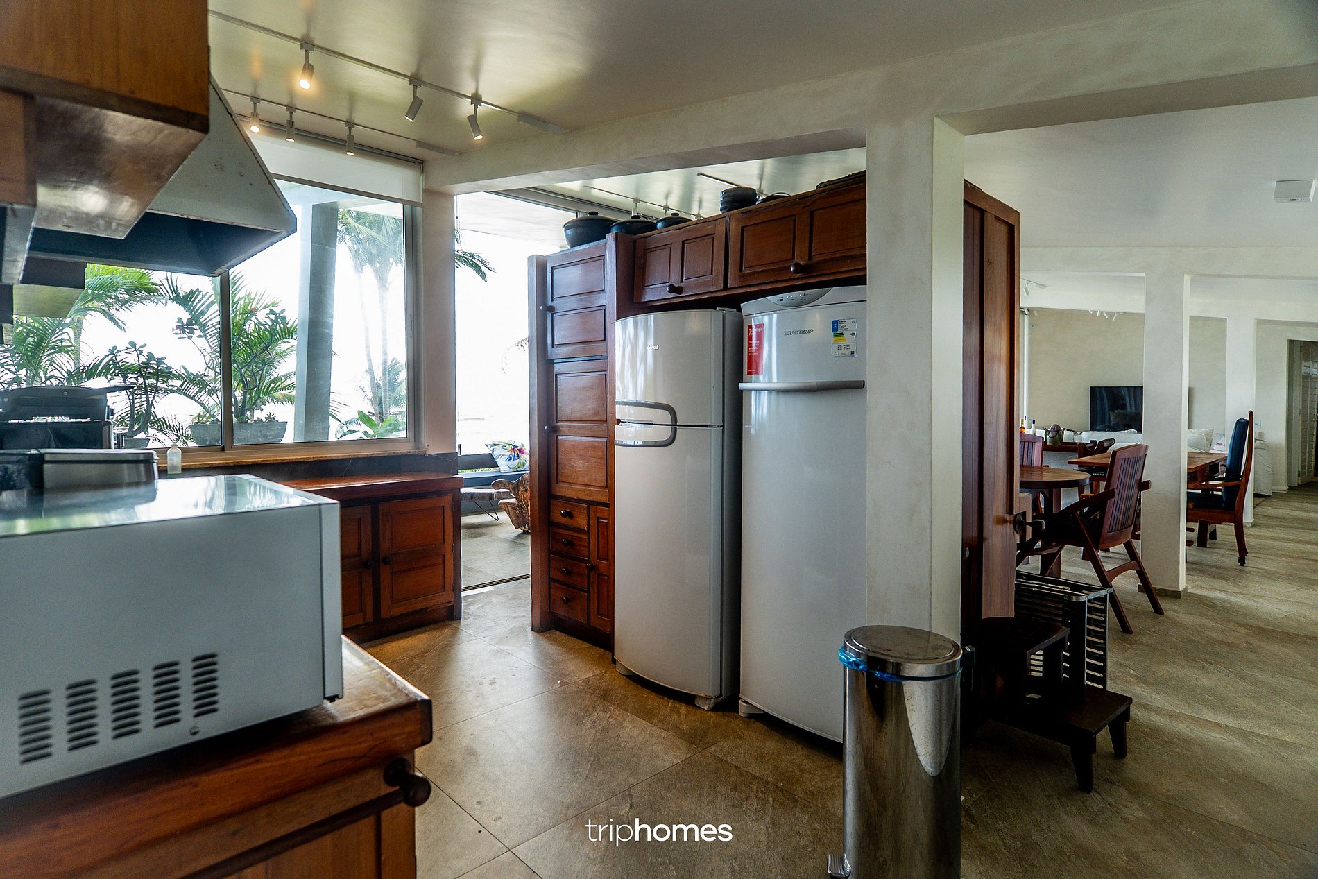 • Varanda Gourmet: duas mesas de madeira (6 e 5 lugares), churrasqueira metálica com coifa, bancada em pedra e vista para o coqueiral e o mar.