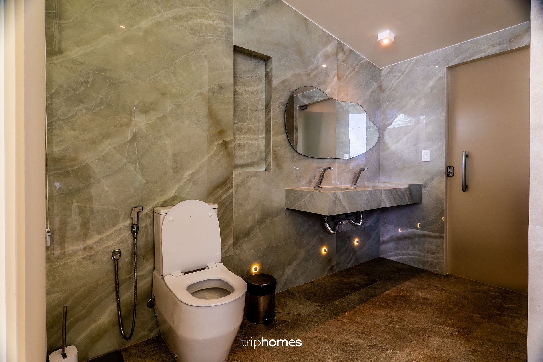• Suíte 5 – Master: cama queen-size, ar-condicionado Gree inverter, closet com oito portas, varanda privativa e banheiro com duas pias, espelho orgânico e box em vidro.