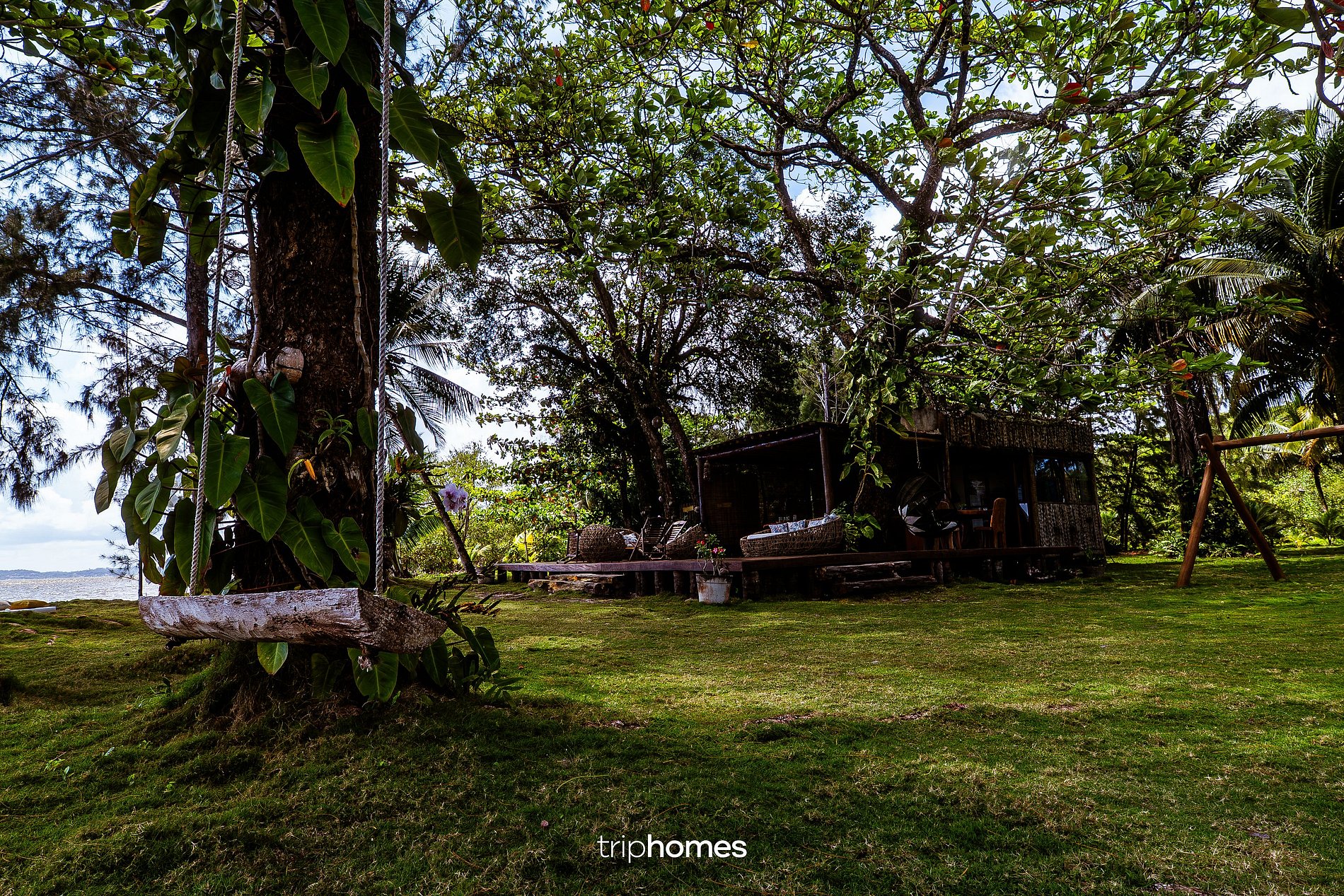 O jardim exuberante à beira-mar, com coqueiros, pinheiros tropicais e gramado se estende até a areia.
