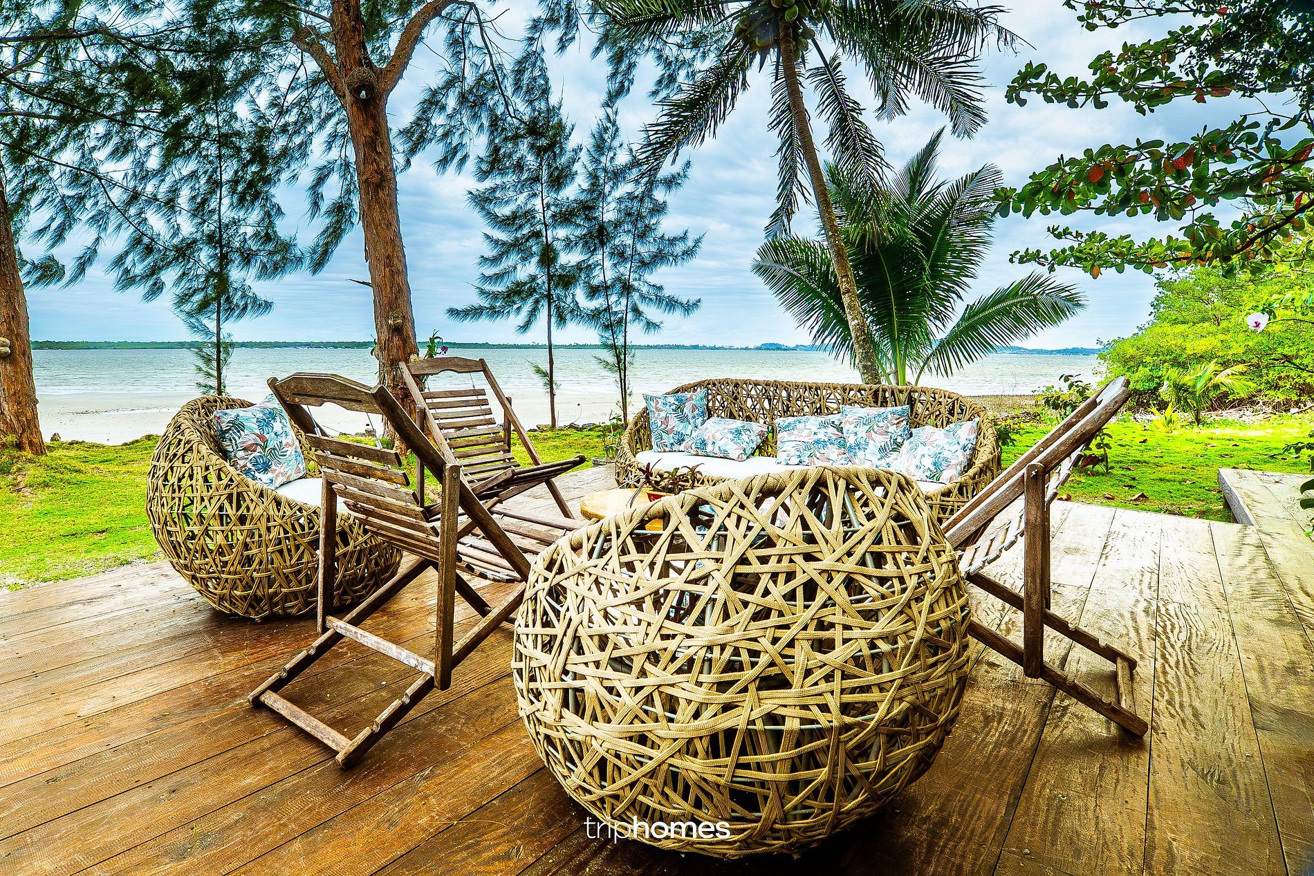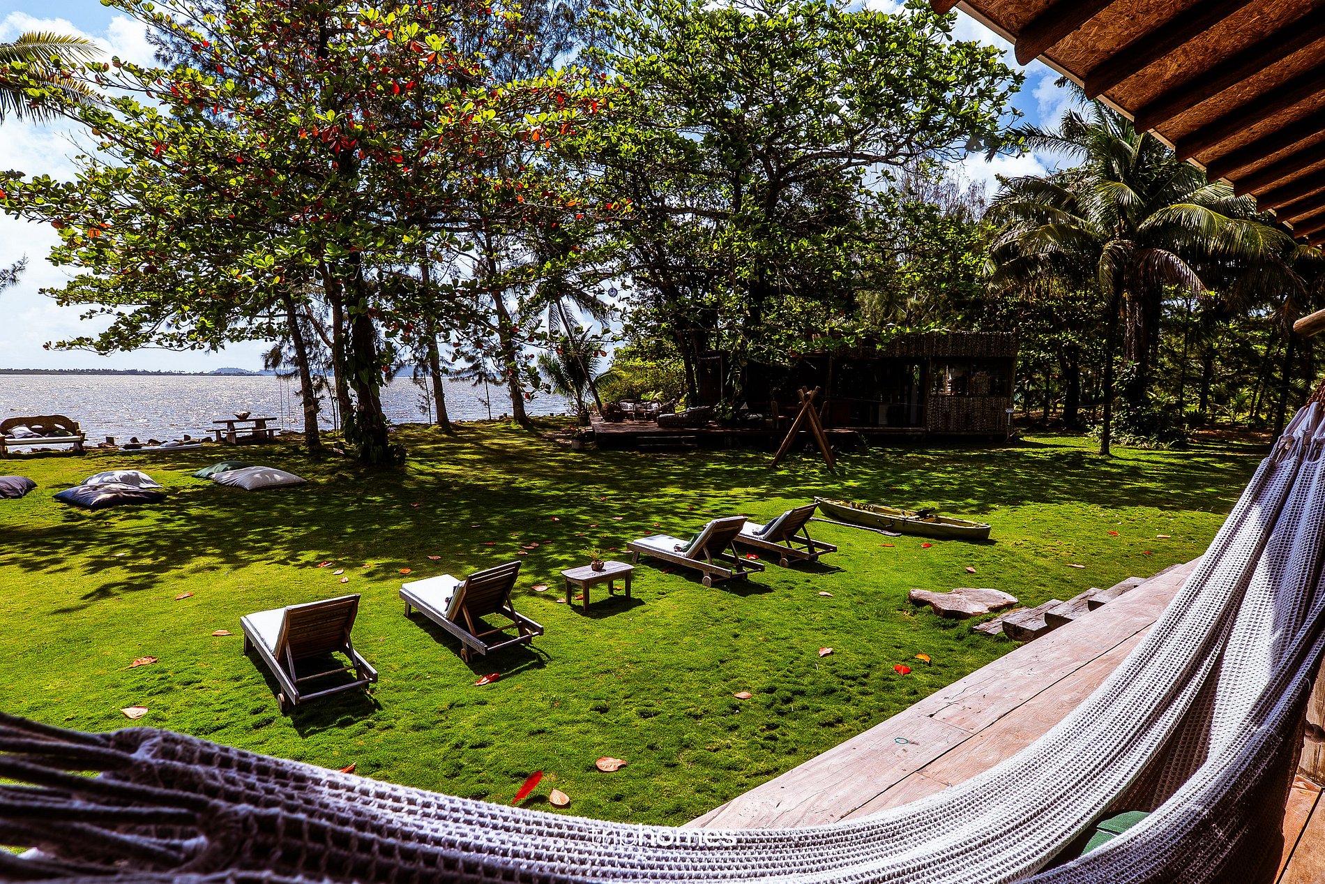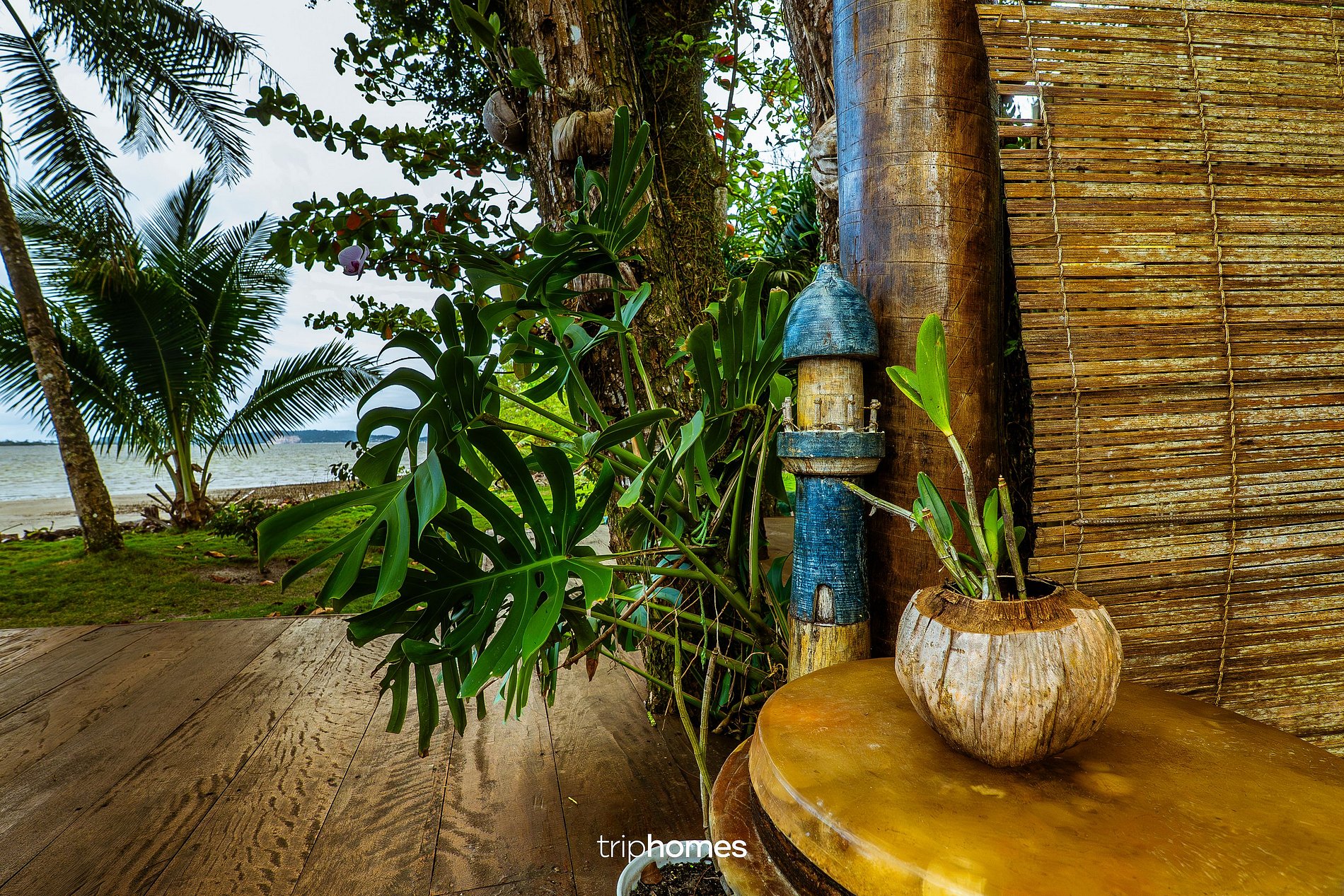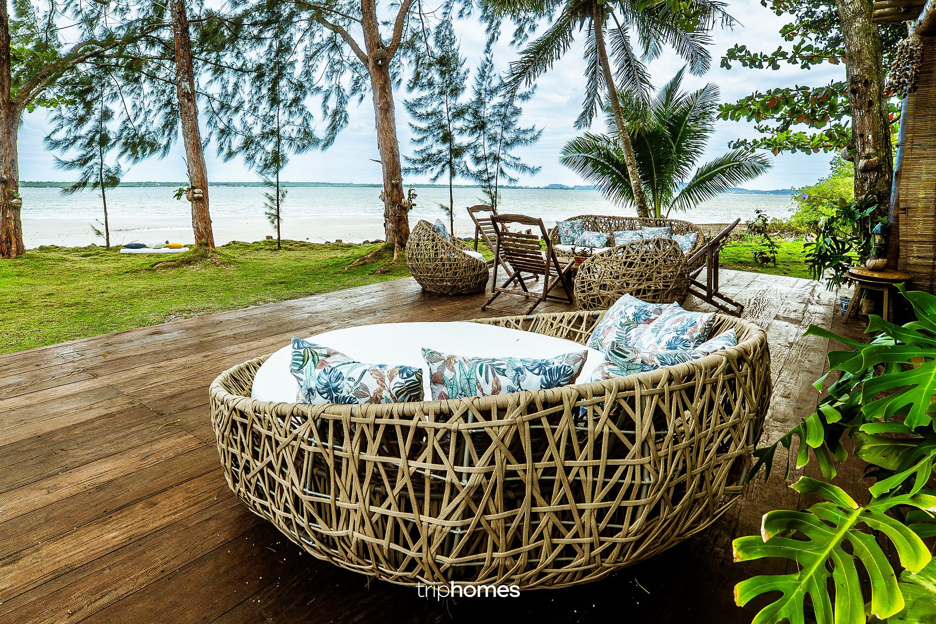 A área externa é um dos pontos altos da propriedade, com gramado à beira-mar, coqueiros, árvores nativas e vegetação preservada.