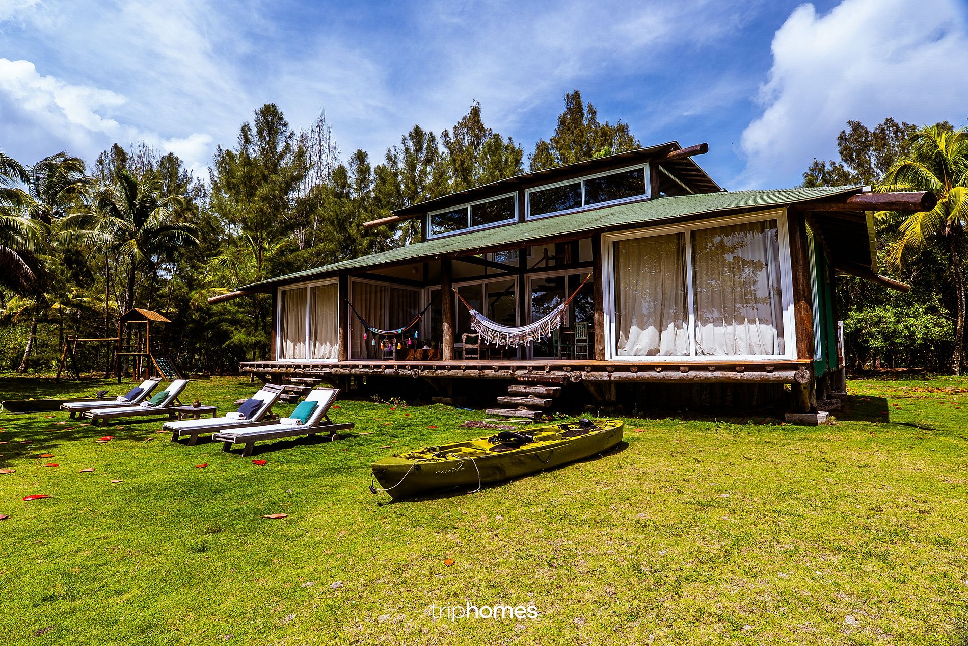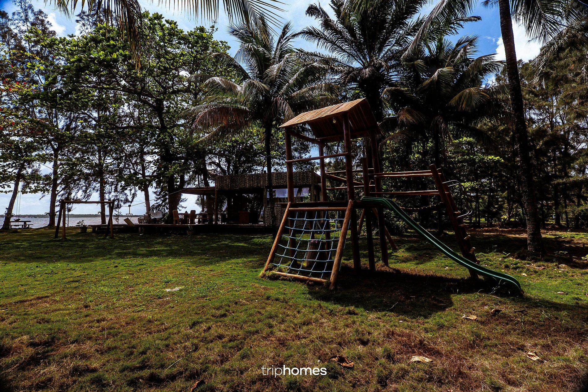No lado esquerdo, há uma área infantil com dois balanços menores e uma tirolesa em eucalipto tratado com cabos de aço.