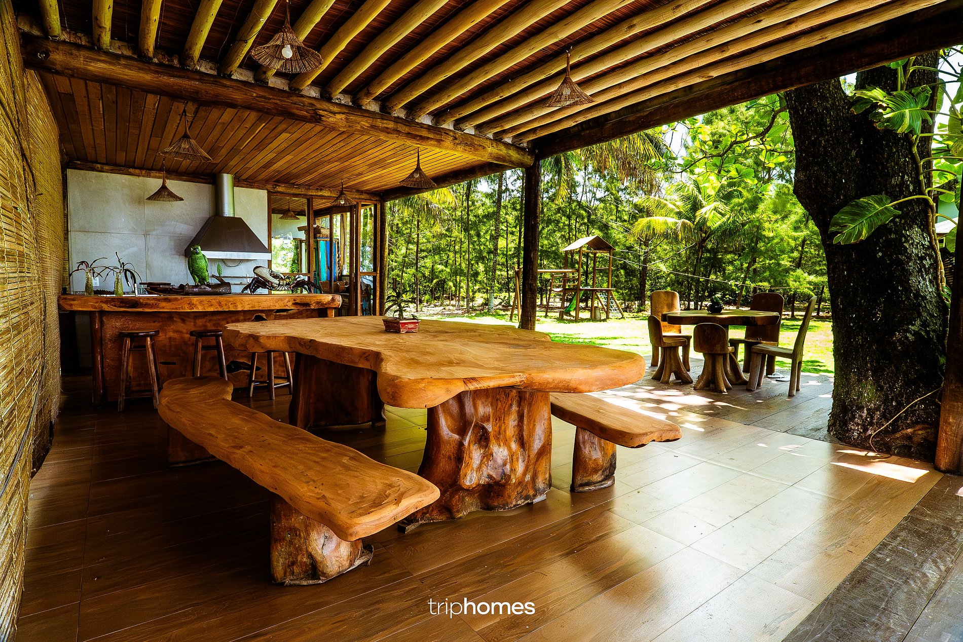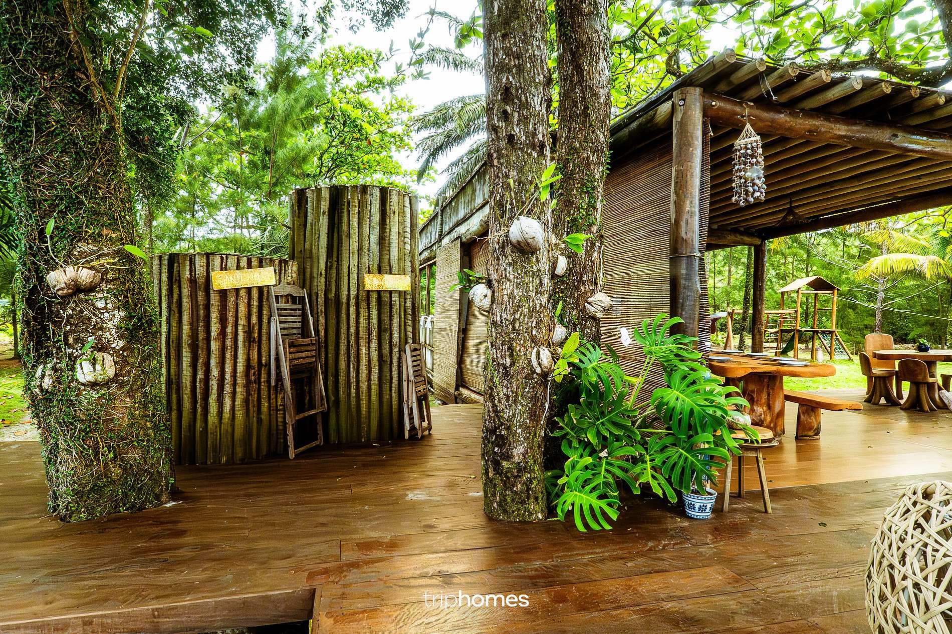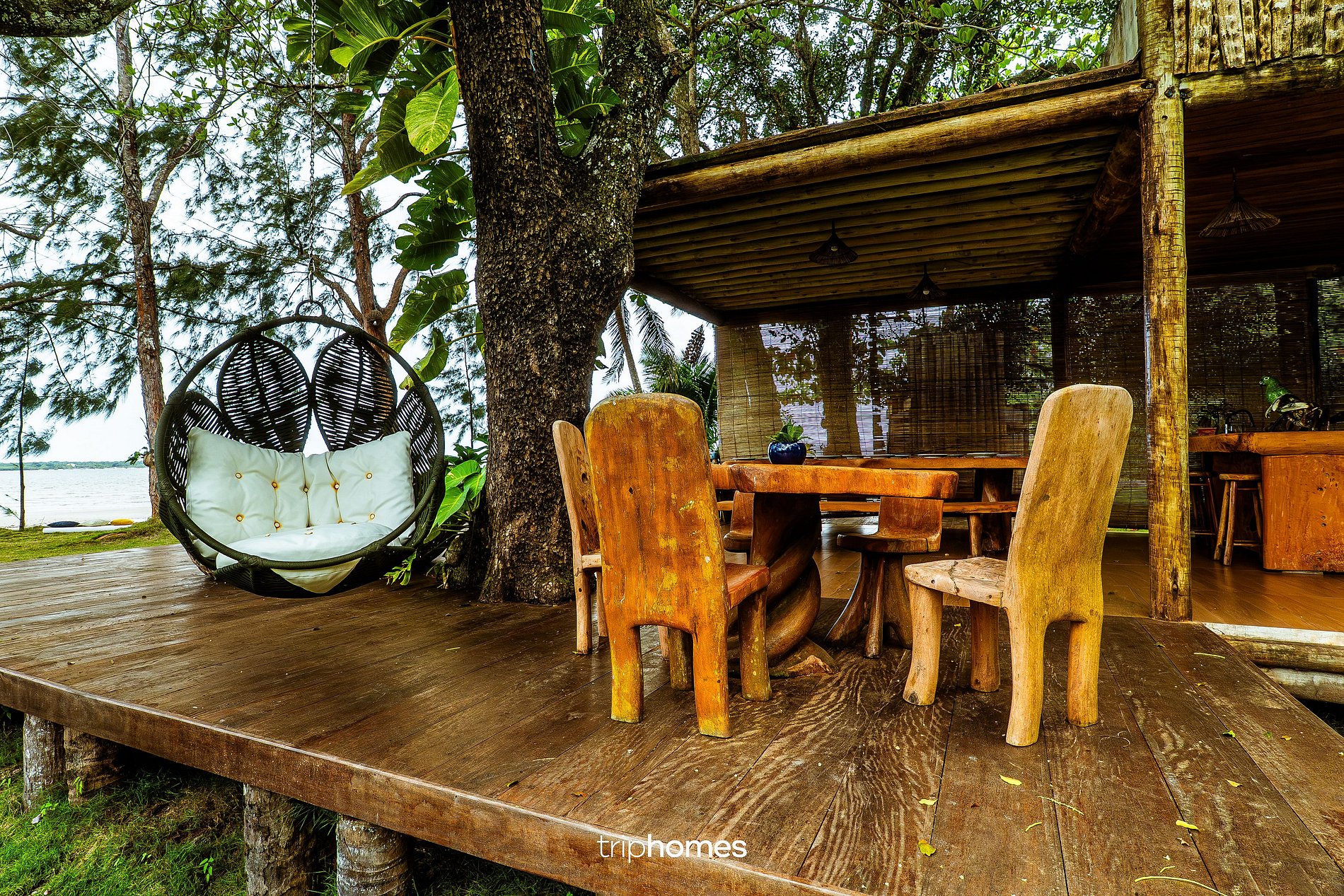 Conta com balanços de madeira, bancos rústicos com almofadas, mesa longa em madeira, colchonetes de meditação, sete almofadões, quatro espreguiçadeiras e quatro redes.