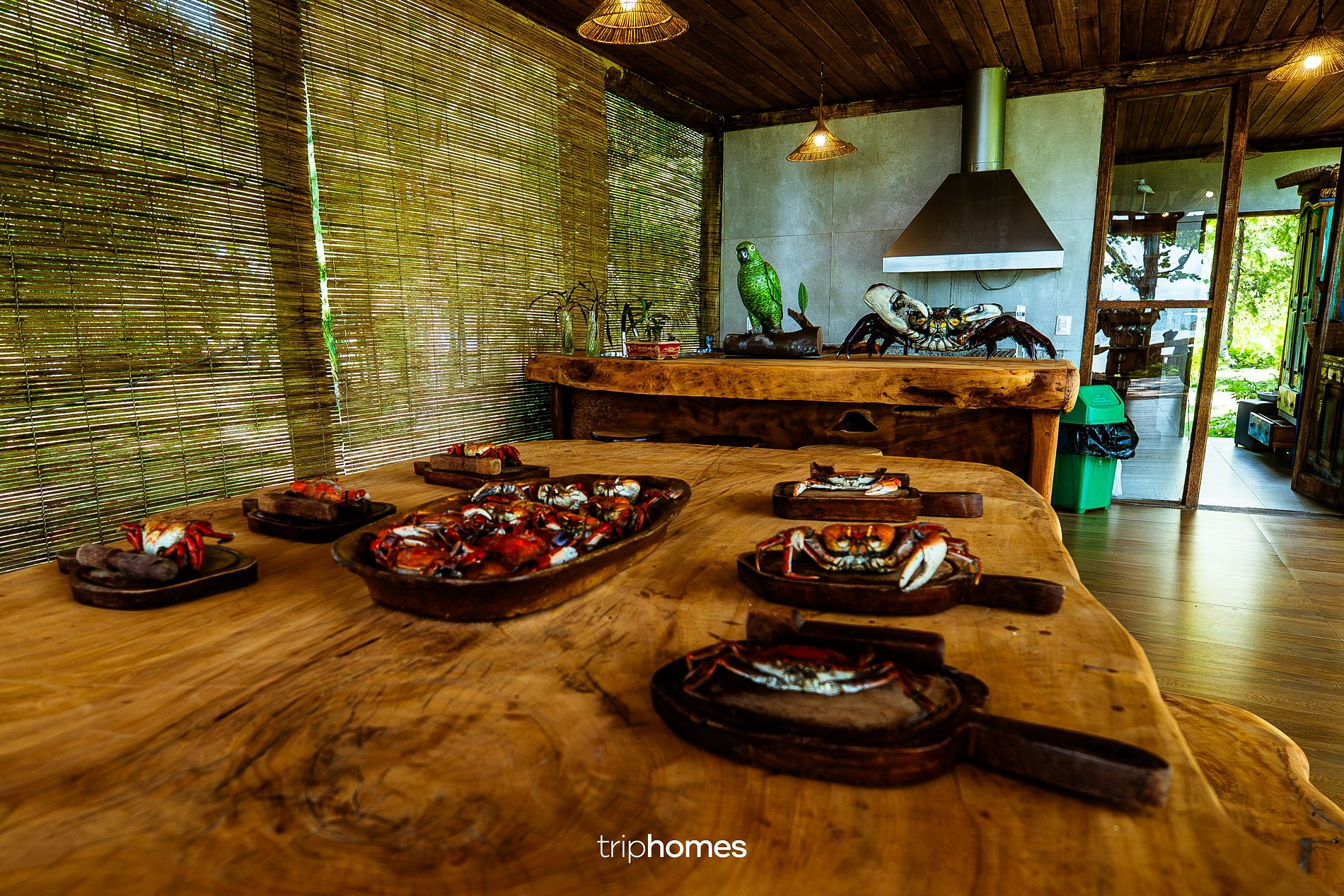 O design privilegia ventilação cruzada, iluminação natural e integração total com a paisagem, enquanto o mobiliário artesanal em madeira e fibras naturais reforça a estética leve e despretensiosa de um luxo sustentável.