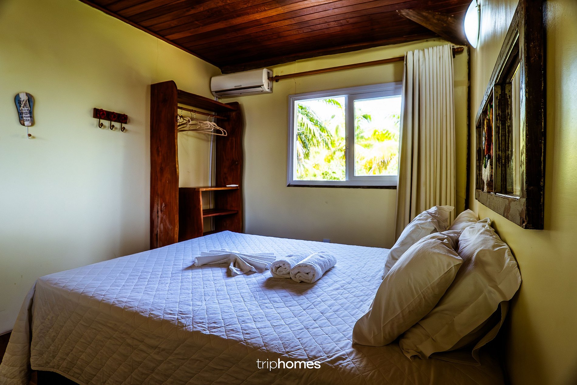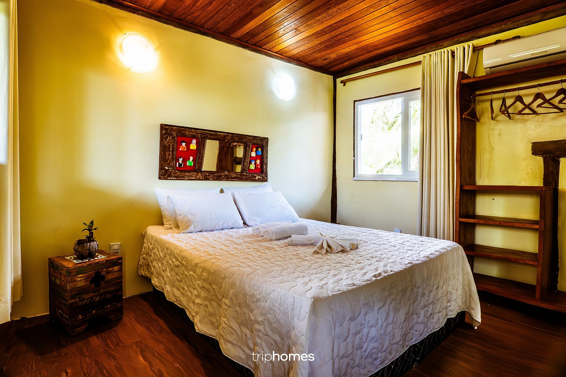Cama de casal, ar-condicionado, guarda-roupa de madeira, espelho e pia artesanal.