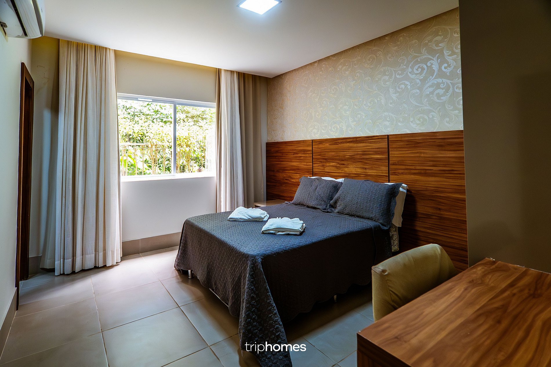 Suíte 4: 1 cama de casal, ar-condicionado moderno, mesa de apoio e banheiro completo.