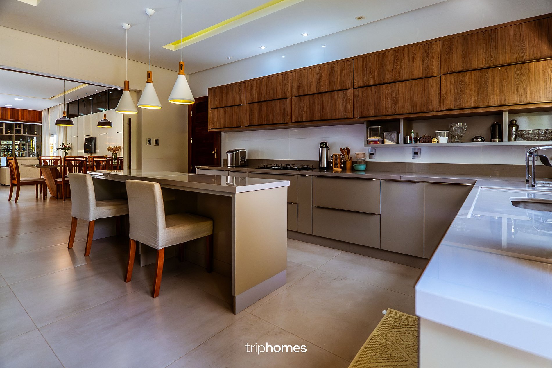 Cozinha: moderna e equipada — cooktop Itatiaia, forno elétrico Philco, micro-ondas Brastemp, geladeira Consul Frost Free, máquina de gelo e utensílios completos para até 12 pessoas.A casa conta com 6 quartos, sendo 5 suítes completas, e ampla área social integrada.