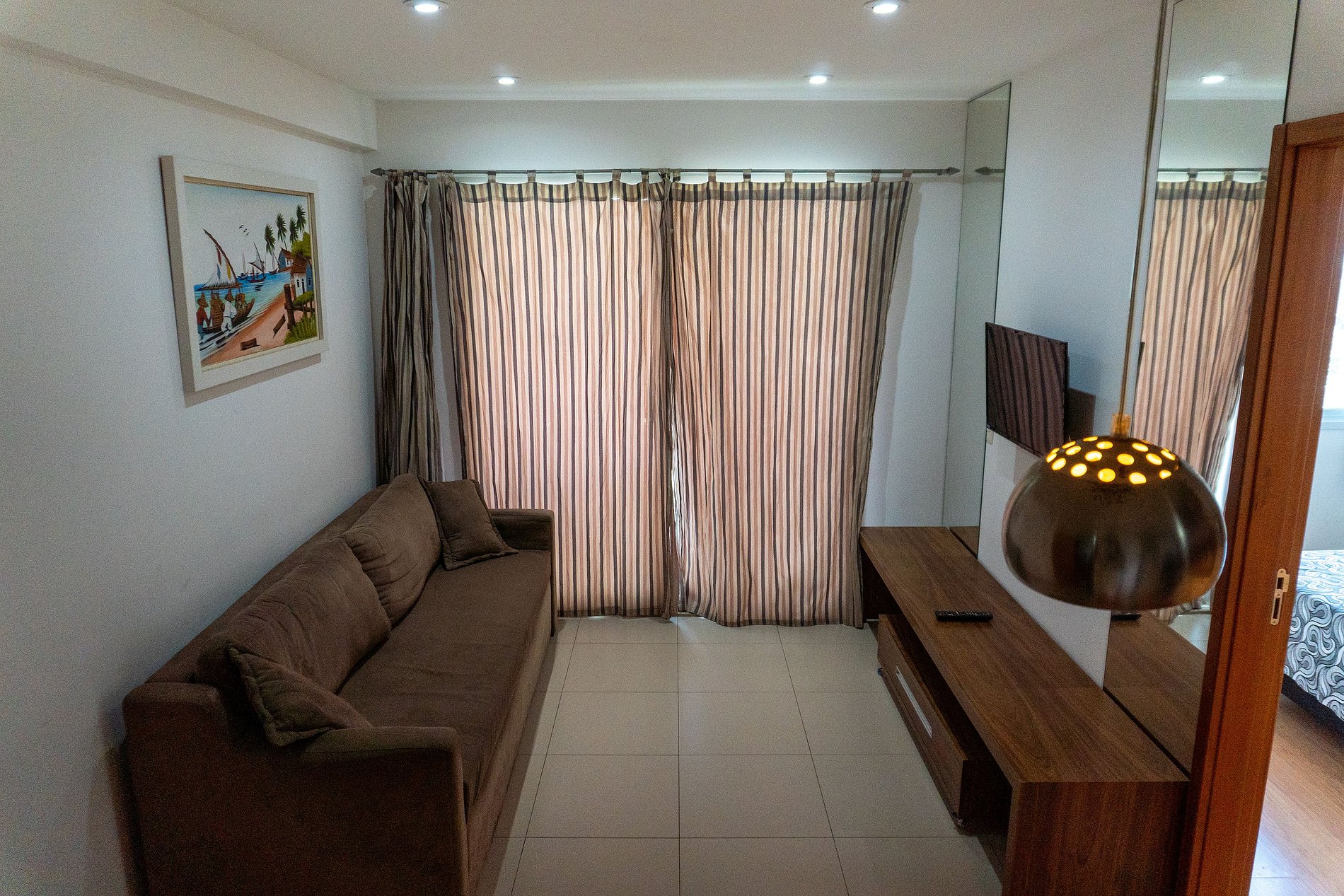 Área de estar climátizada com ar-condicionado TV smart, sofá-cama confortável e espaço integrado.