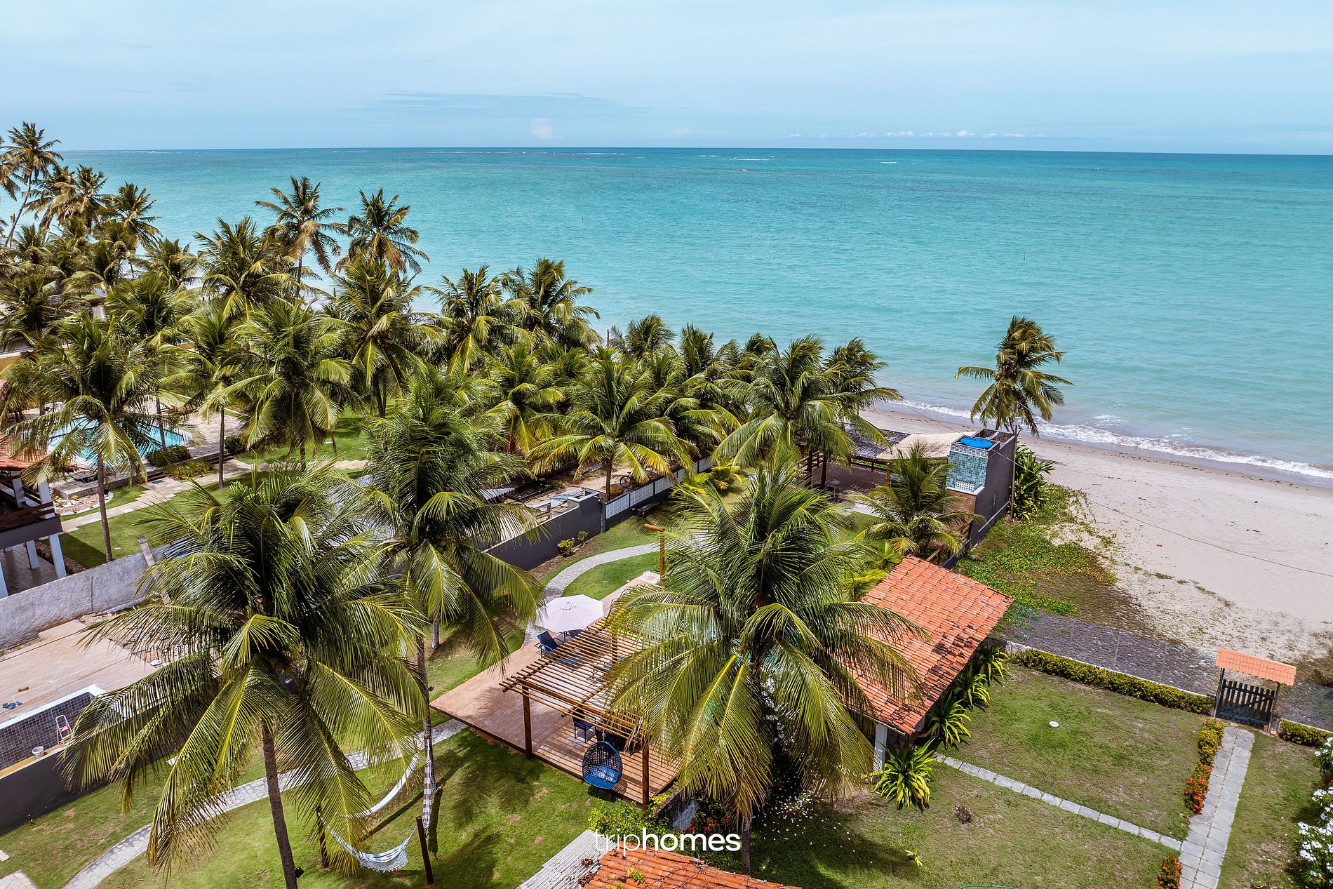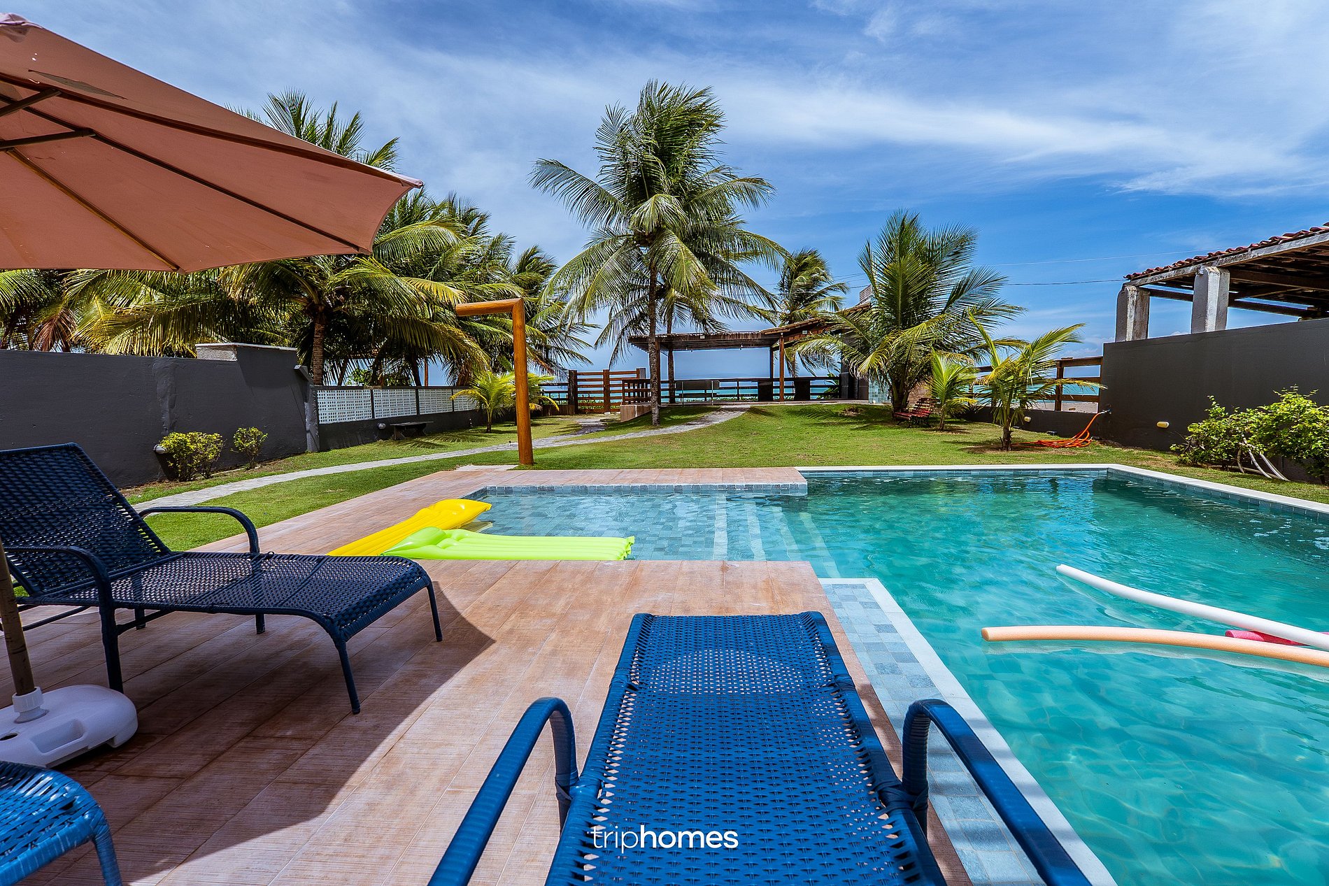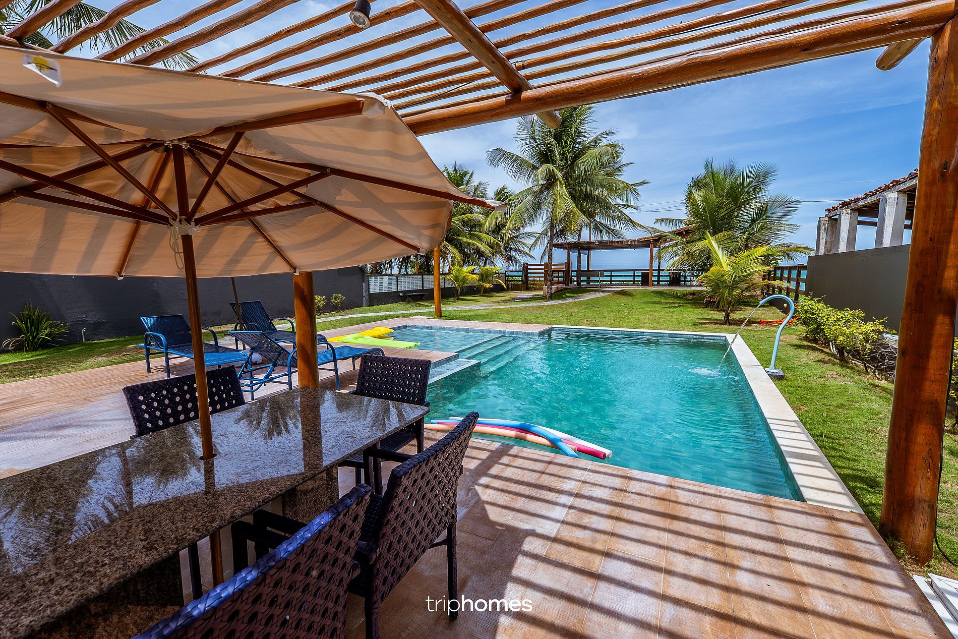 O destaque da casa é o amplo jardim com coqueiros e acesso direto à praia. • Piscina com área infantil • Espreguiçadeiras • Redes • Chuveiro externo • Caiaques • Boias e macarrões de piscina • Pérgolas e áreas sombreadas • Acesso direto à praia