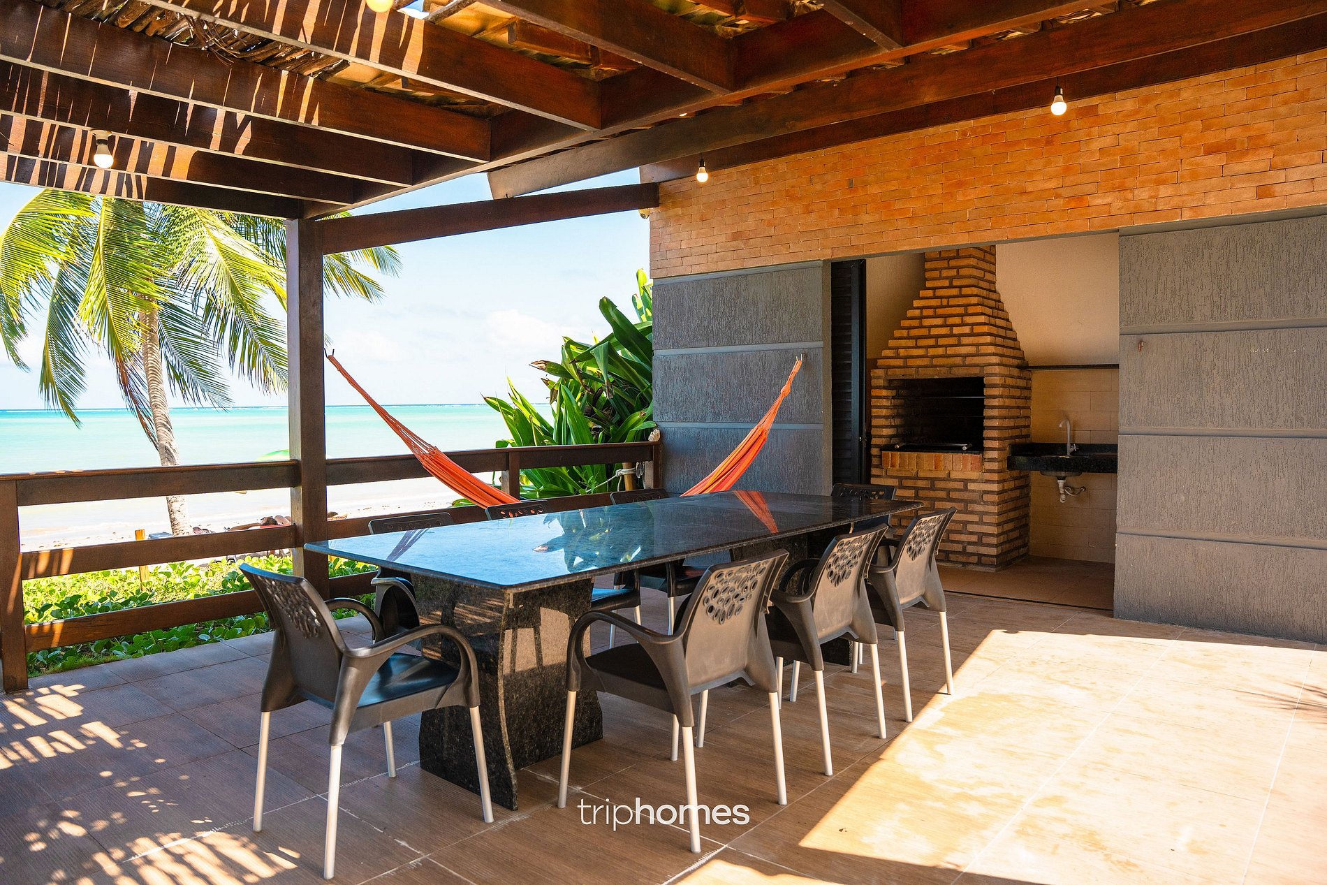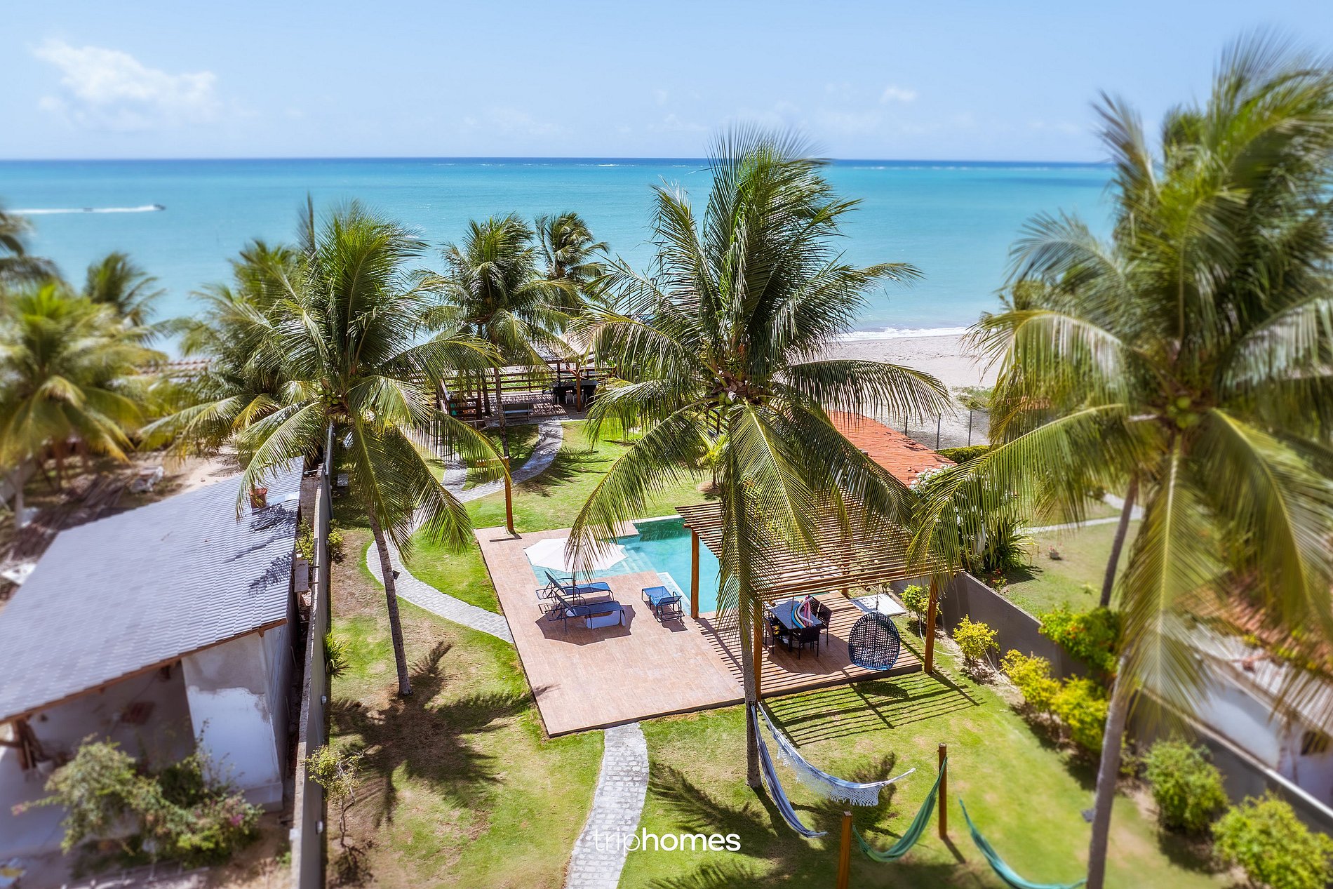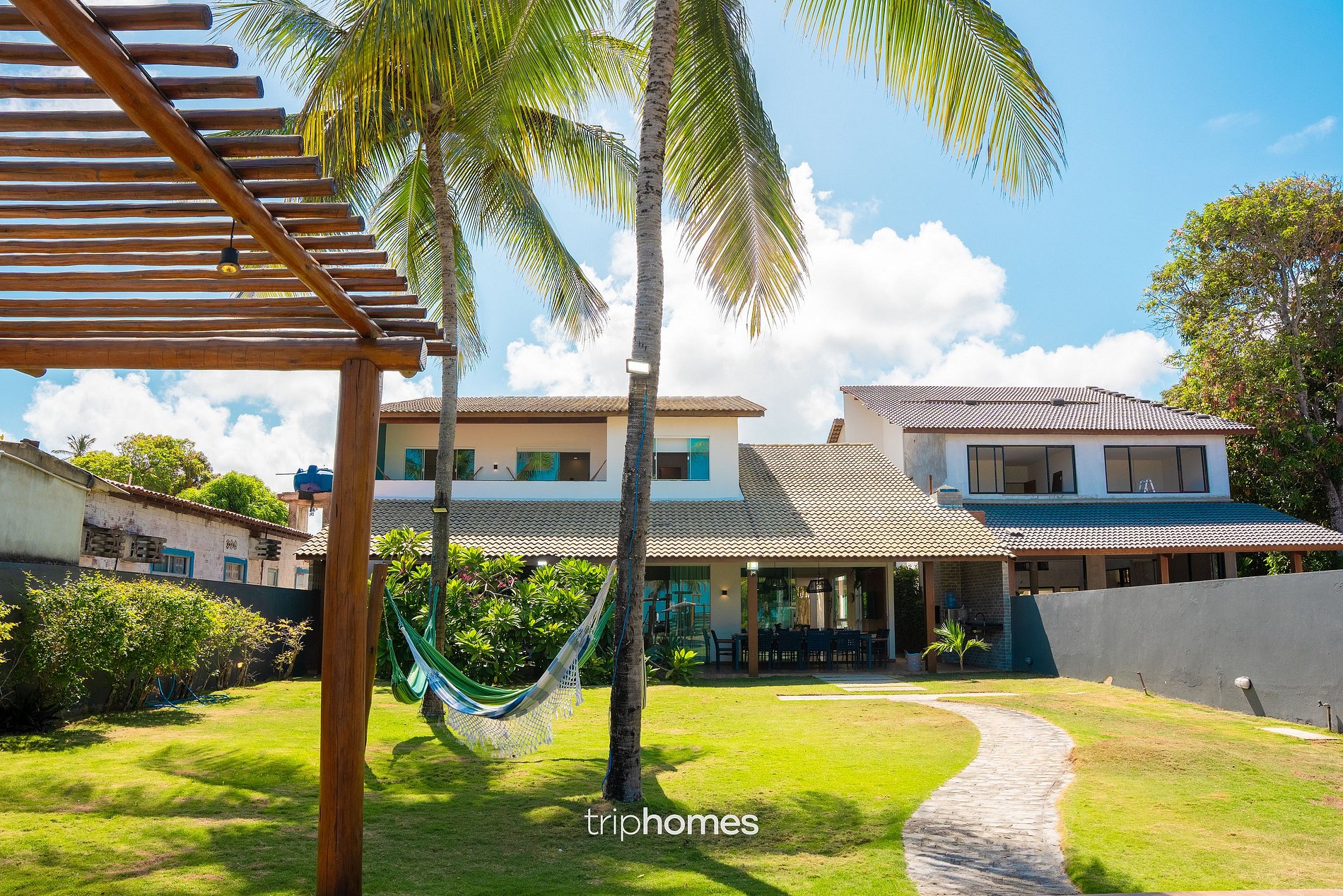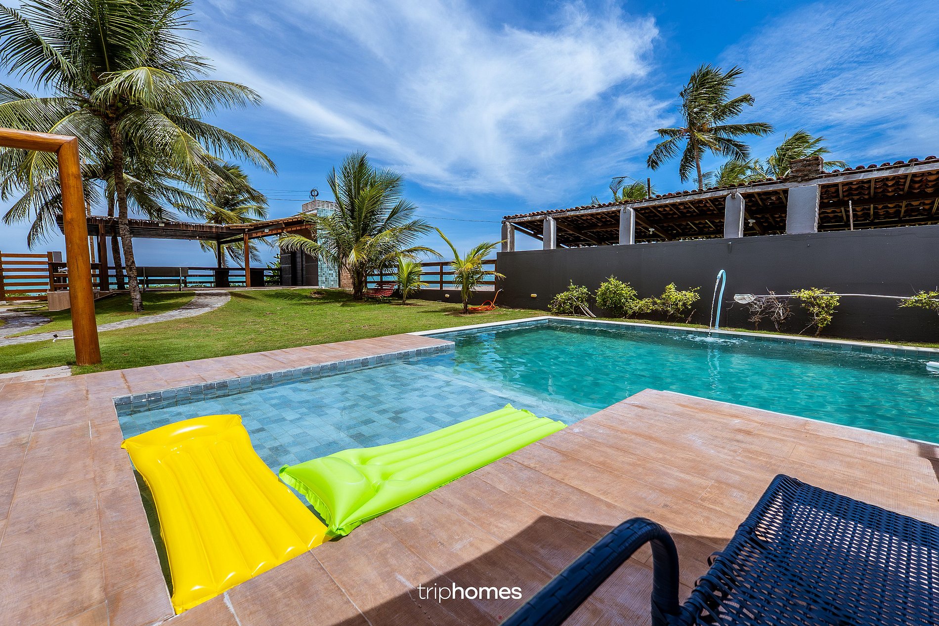O destaque da casa é o amplo jardim com coqueiros e acesso direto à praia. • Piscina com área infantil • Espreguiçadeiras • Redes • Chuveiro externo • Caiaques • Boias e macarrões de piscina • Pérgolas e áreas sombreadas • Acesso direto à praia