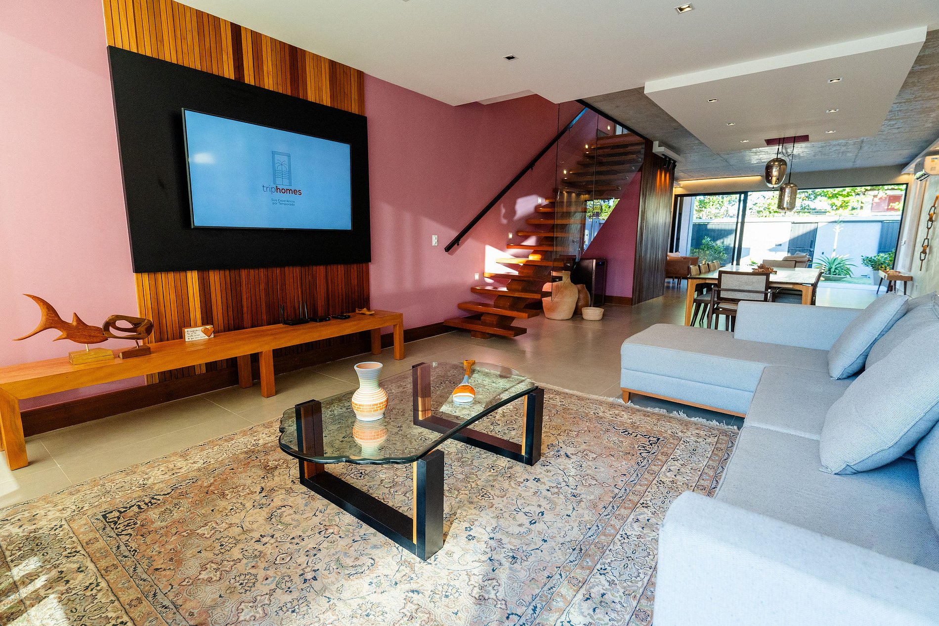 Sala com TV, sofás confortáveis e mesa de jantar para 8 pessoas