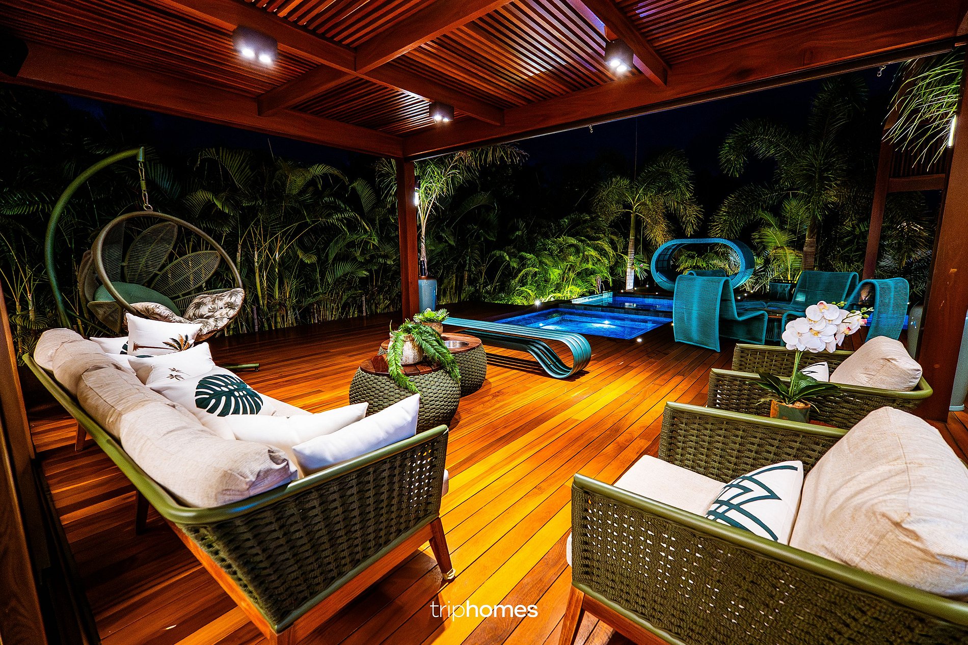 A área de lazer externa tem um espaço magnífico em mármore e granito, uma hidro e piscina sensacionais com destaque para a borda transparente e infinita, proporcionando um vislumbre extraordinário do pôr do sol. Um deck de madeira maravilhoso integrado à área gourmet com churrasqueira, SMARTV de 80 polegadas, som ambiente surround, cadeiras e espreguiçadeiras de luxo, e um balanço para você se registrar nesse ambiente simplesmente fantástico.